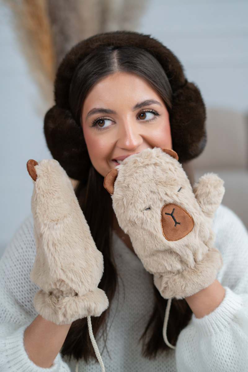 Rękawiczki kapibara w kolorze fango to stylowy i przytulny dodatek, który doskonale sprawdzi się w chłodne dni. Wykonane z miękkiego, futrzanego materiału, gwarantują ciepło, komfort i miłe otulenie dłoni. Subtelny odcień fango – połączenie beżu i szarości – nadaje im elegancki, naturalny charakter, pasujący do wielu zimowych stylizacji. Ich delikatna, puszysta faktura inspirowana futerkiem kapibary dodaje uroku i oryginalności. To idealny wybór dla osób ceniących wygodę, ciepło i stonowaną, nowoczesną estetykę.