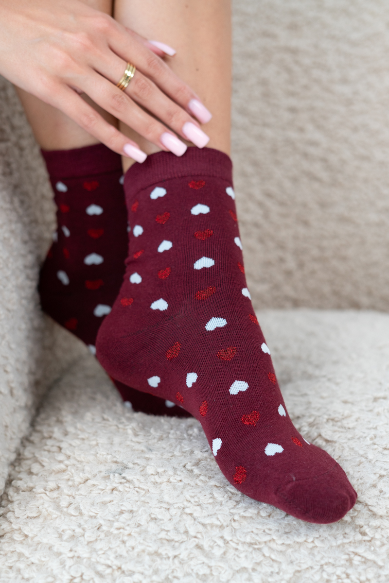 Skarpetki damskie w serduszka – Lovirae to zestaw 3 par w różnych kolorach. Wykonane z miękkiej, bawełnianej dzianiny zapewniają wygodę i odpowiednią przewiewność przez cały dzień. Elastyczny ściągacz dobrze trzyma się na nodze, nie powodując ucisku. Wzór w drobne serduszka dodaje im romantycznego i dziewczęcego charakteru, dzięki czemu świetnie sprawdzą się zarówno do codziennych stylizacji, jak i do noszenia w domu.