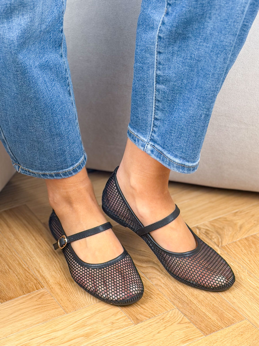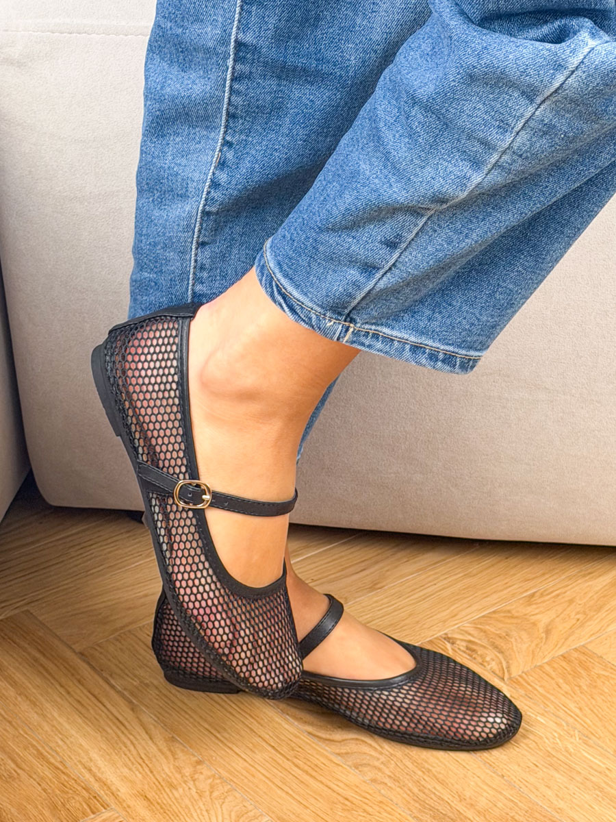 Balerinki siateczkowe z paskiem Czarne – Light As Air to lekka i stylowa propozycja dla kobiet ceniących wygodę oraz subtelną elegancję na co dzień. Model wykonany jest z delikatnej, przewiewnej siateczki, która zapewnia komfort noszenia i doskonale sprawdza się w cieplejsze dni. Klasyczny czarny kolor nadaje balerinkom uniwersalnego charakteru i ułatwia dopasowanie do wielu stylizacji – od casualowych po bardziej eleganckie. Pasek z regulowanym zapięciem stabilizuje stopę i dodaje całości dziewczęcego uroku. Smukły nosek oraz lekka konstrukcja podkreślają nowoczesny, minimalistyczny styl modelu. Wygodna wkładka zwiększa komfort podczas chodzenia, dzięki czemu balerinki sprawdzą się zarówno na co dzień, jak i podczas dłuższych wyjść. To idealne połączenie funkcjonalności, lekkości i modnego designu.