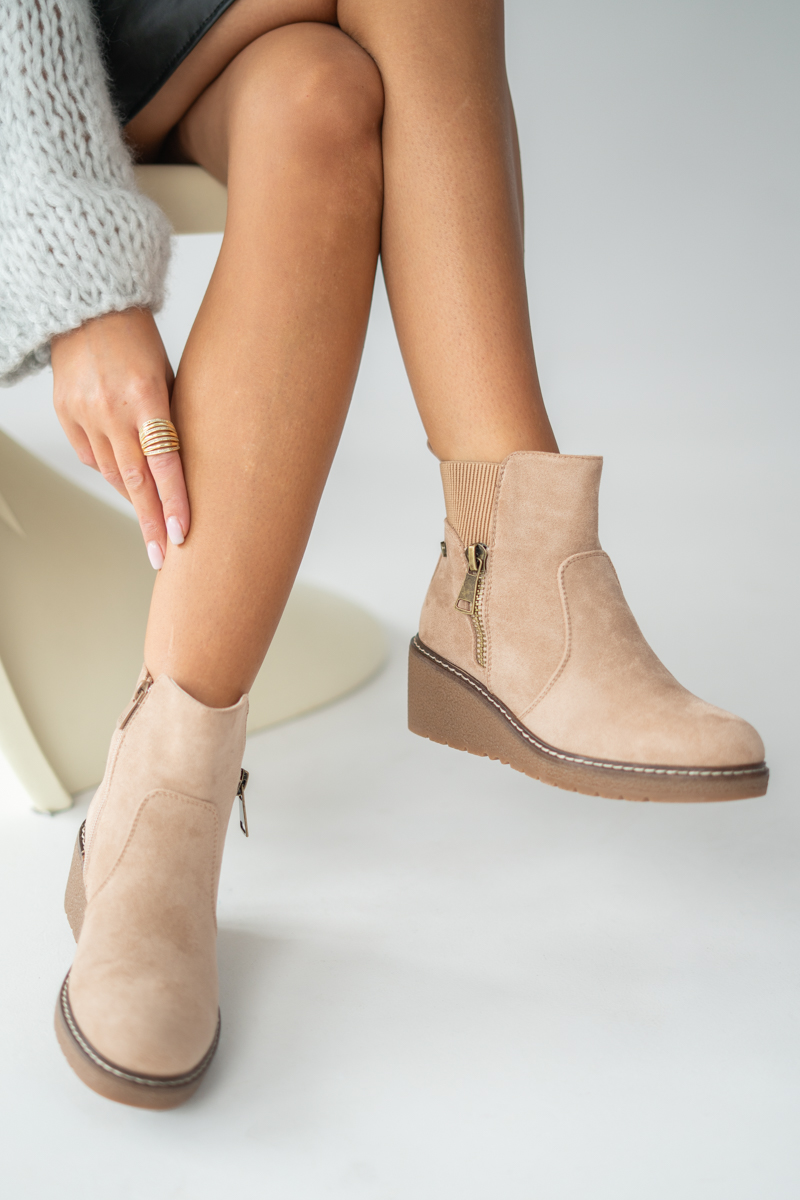 Botki zamszowe na koturnie z suwakiem Beżowe – Ravellea