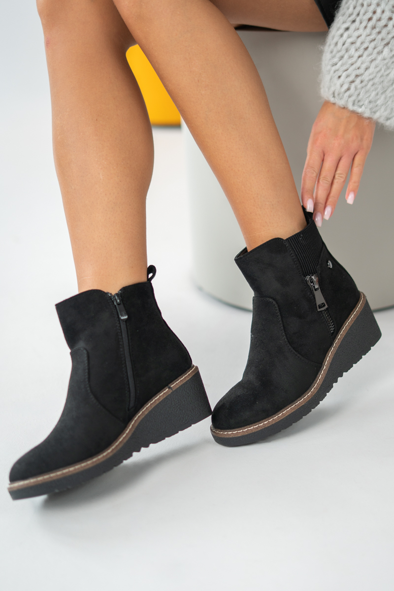 Botki zamszowe na koturnie z suwakiem Czarne – Ravellea