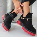 Czarne botki damskie Rouvelle z kontrastową, czerwoną podeszwą to propozycja dla kobiet, które lubią wyróżniać się w tłumie. Wykonane z miękkiego zamszowego materiału, zapewniają wygodę i stylowy wygląd na co dzień. Solidna, masywna podeszwa z wyrazistym bieżnikiem dodaje charakteru i gwarantuje stabilność nawet w trudniejszych warunkach. Dodatkowym atutem jest ozdobny pasek wokół kostki z zawieszkami, który nadaje całości modnego, nowoczesnego akcentu. To idealne obuwie do miejskich stylizacji – świetnie komponuje się z jeansami, skórzaną kurtką czy swetrem oversize, tworząc wyrazisty, casualowy look.