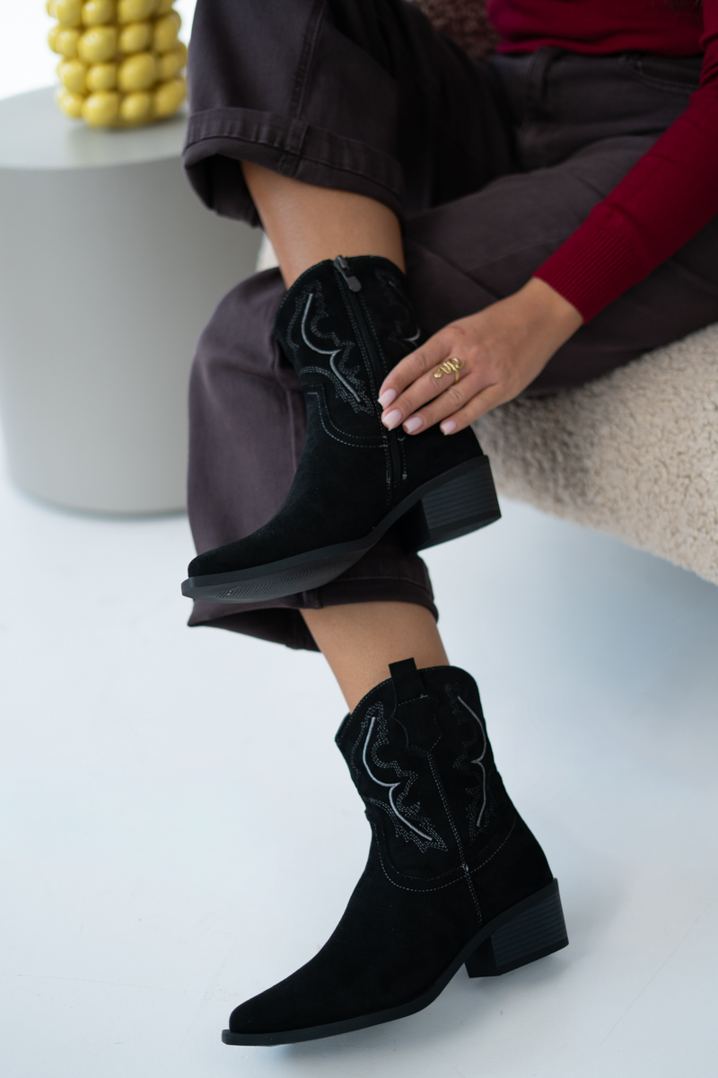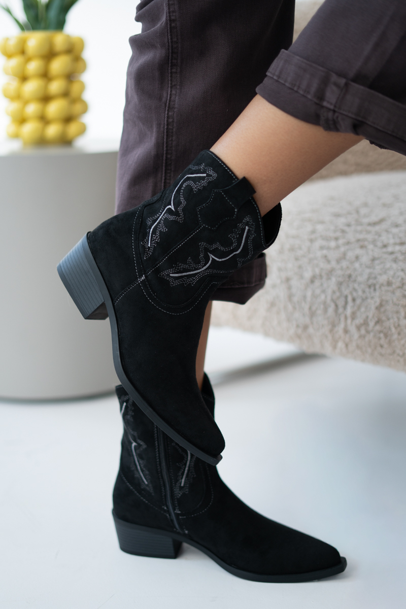 Botki kowbojki motocyklowe Czarne – Dorvanna to stylowe obuwie inspirowane klasycznym stylem westernowym. Wykonane z czarnego materiału o zamszowym wykończeniu, posiadają charakterystyczne przeszycia w kowbojskim klimacie, które nadają im niepowtarzalnego charakteru. Stabilny, niski obcas i wygodna cholewka do kostki sprawiają, że są praktyczne i komfortowe w noszeniu na co dzień. Te botki będą świetnym uzupełnieniem casualowych stylizacji – idealnie komponują się z jeansami typu skinny, sukienkami w stylu boho, a także spódnicami midi. Dzięki uniwersalnej czerni można je łatwo zestawiać z różnymi kolorami i fakturami.