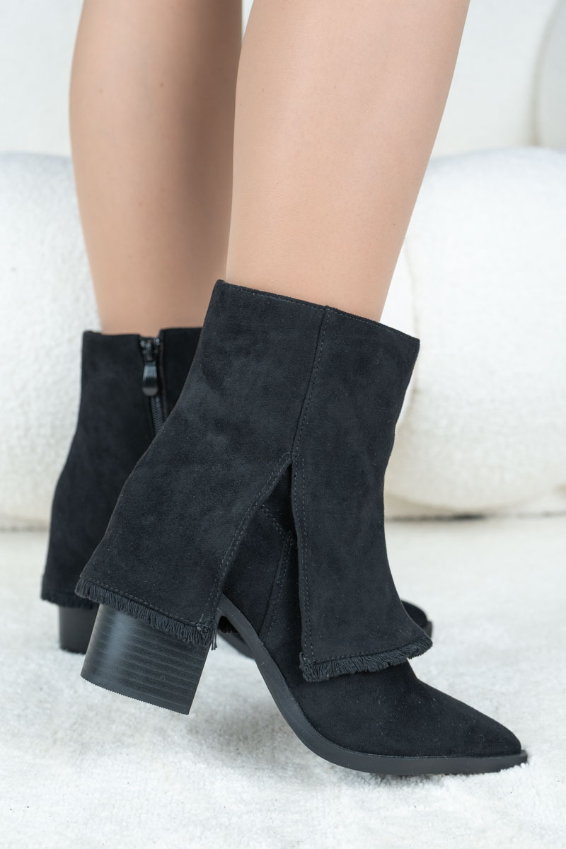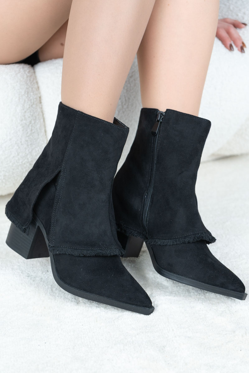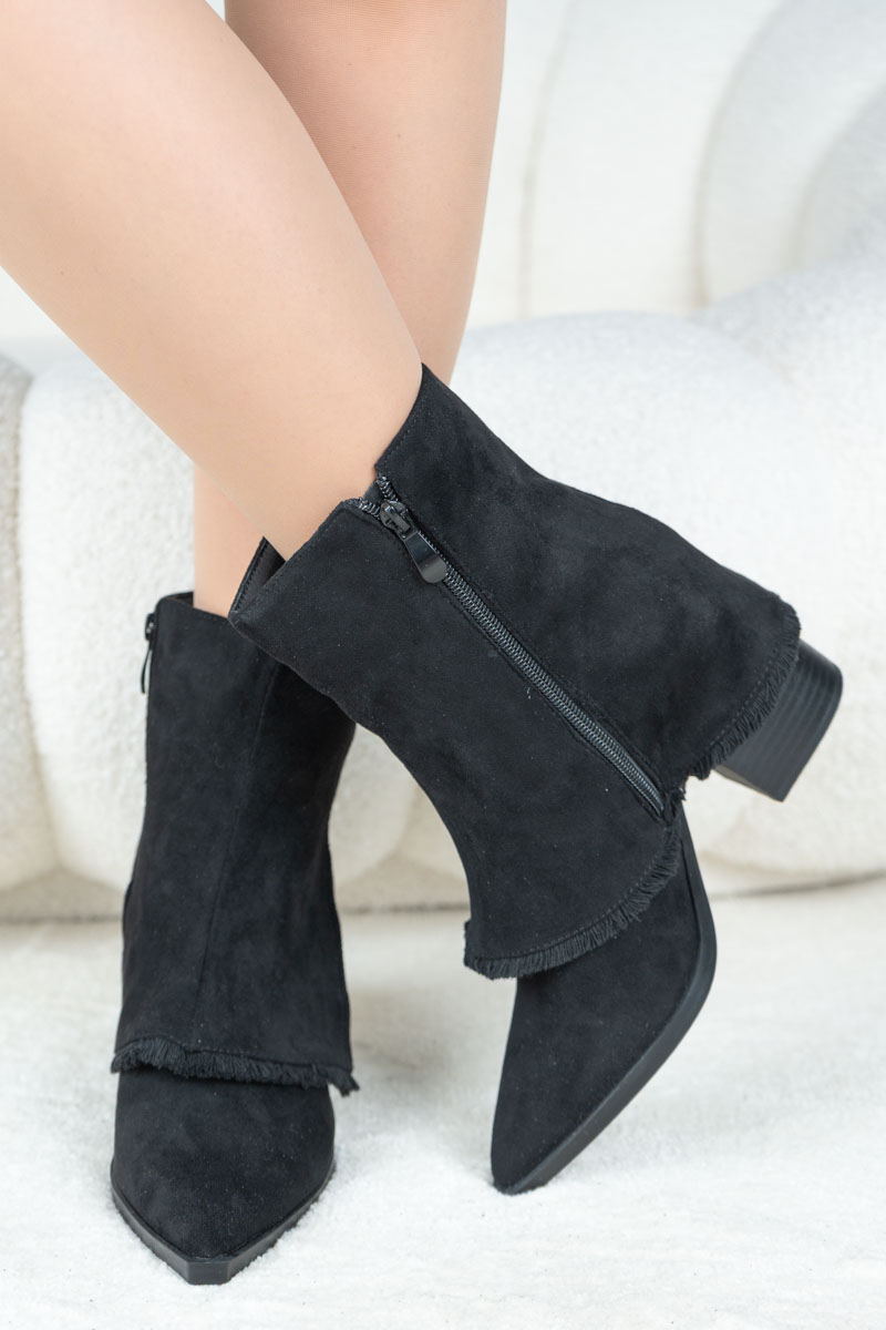 Botki na słupku Belivane w czerni to stylowy wybór dla osób ceniących nowoczesny, nieco drapieżny charakter obuwia. Wykonane z miękkiego, zamszowego materiału prezentują unikatowe strzępienia przy cholewce, które dodają im oryginalności i modowego wykończenia. Stabilny słupek zapewnia komfort podczas codziennego noszenia, a boczny zamek ułatwia szybkie zakładanie. Smukły, lekko szpiczasty nosek podkreśla elegancką linię buta. To model, który świetnie sprawdzi się zarówno w codziennych, jak i bardziej dopracowanych stylizacjach, dodając im wyrazistego, nowoczesnego akcentu.