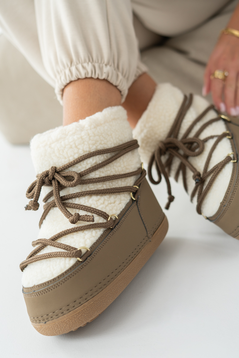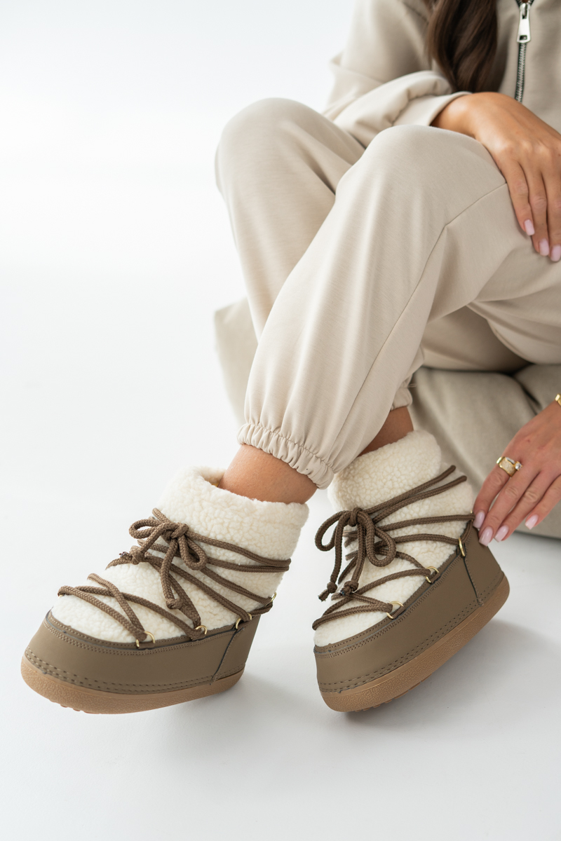 Śniegowce damskie z fŚniegowce damskie z futerkiem Fango to praktyczne i modne obuwie zimowe inspirowane kultowym fasonem. Mają wyższą cholewkę z ozdobnym sznurowaniem, które nadaje całości sportowego charakteru i pozwala na dobre dopasowanie. Puszyste futerko w jasnym kolorze, zapewnia ciepło i komfort noszenia w chłodne dni. Solidna, płaska podeszwa izoluje od zimna i wilgoci, a kolor fango sprawia, że buty są uniwersalne i łatwe do zestawienia z zimowymi stylizacjami. To idealny wybór na codzienne spacery i zimowe aktywności.