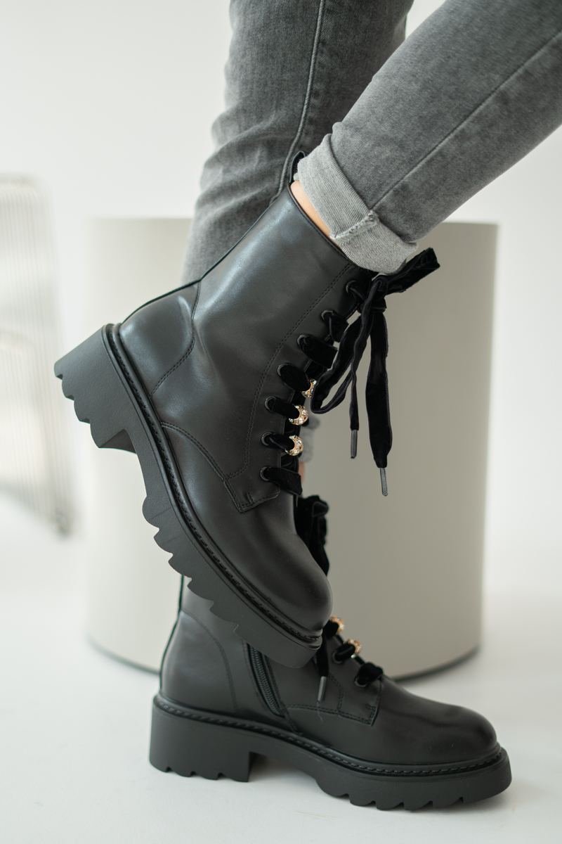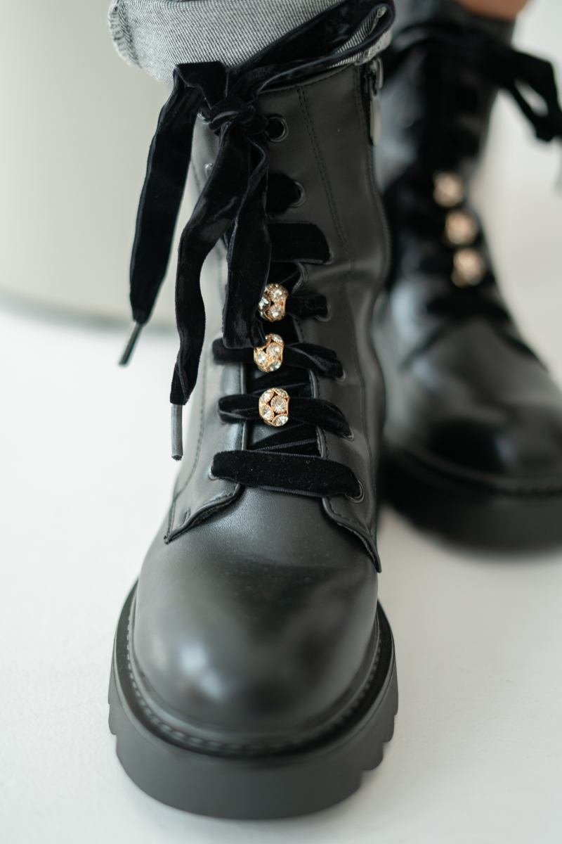 Workery z aksamitnymi wstążkami Czarne – Brelyssa to oryginalne botki, które łączą w sobie rockowy charakter z subtelną nutą elegancji. Wykonane w klasycznej czerni, zyskują wyjątkowy urok dzięki aksamitnym wstążkom zastępującym tradycyjne sznurowadła oraz ozdobnym złotym guzom, które dodają im niepowtarzalnego stylu. Solidna, grubsza podeszwa zapewnia stabilność i wygodę podczas chodzenia, a miękka wyściółka dba o komfort stóp na co dzień. Dzięki praktycznemu zamkowi z boku, zakładanie butów jest szybkie i wygodne. To idealna propozycja dla kobiet, które lubią łączyć nowoczesny design z kobiecymi akcentami – sprawdzą się świetnie w casualowych, jak i bardziej stylowych zestawach.