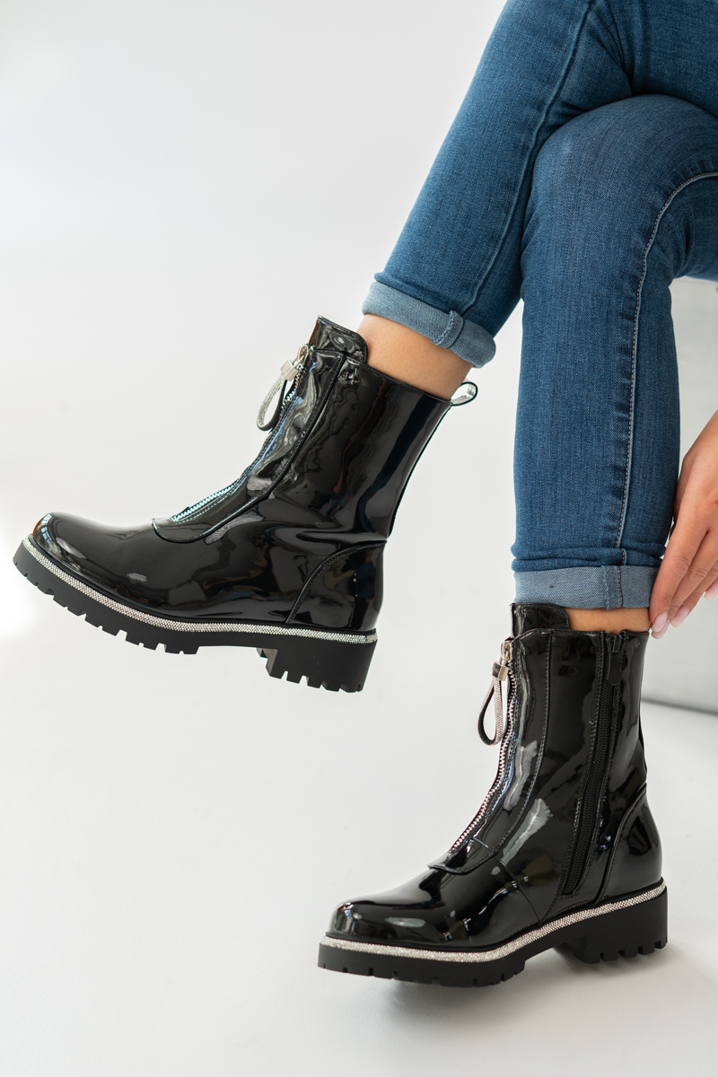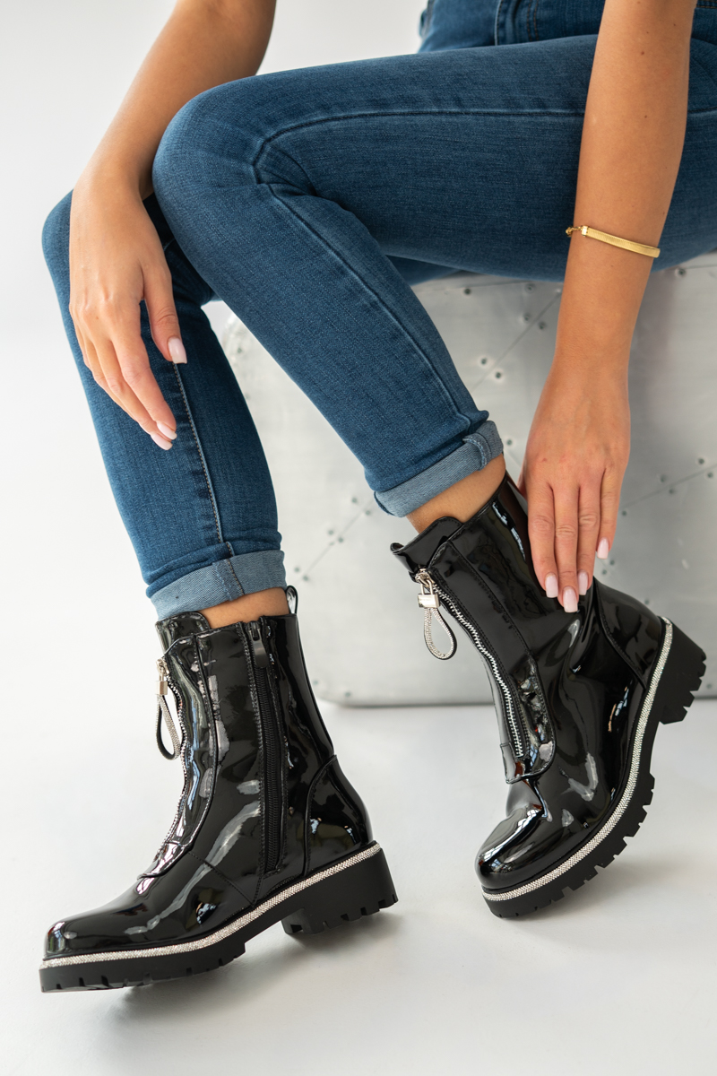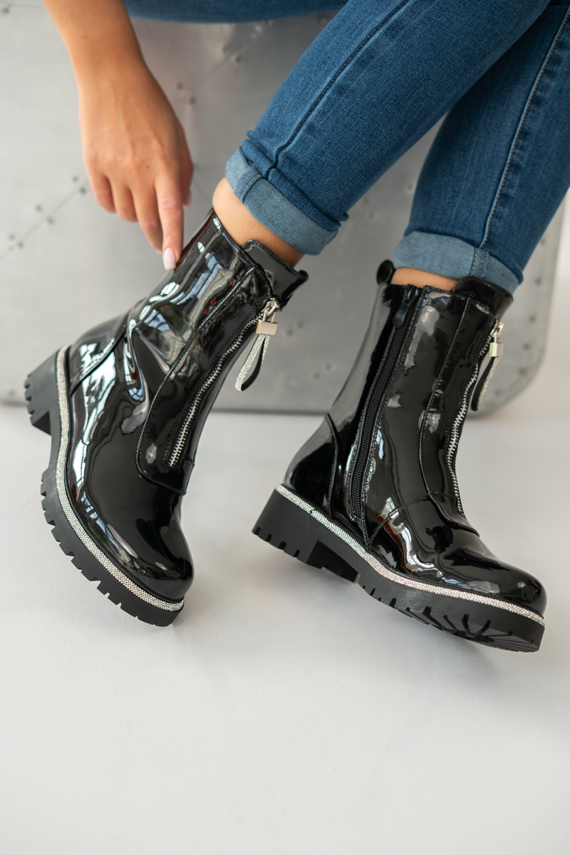 Botki z zamkiem z przodu czarne Corielle to stylowe i praktyczne obuwie na chłodniejsze dni. Wykonane z lakierowanego materiału, prezentują elegancki połysk, który dodaje charakteru każdej stylizacji. Wyposażone w ozdobny zamek z przodu, łączą nowoczesny design z wygodą użytkowania. Posiadają grubszą podeszwę z wyraźnym bieżnikiem, co zapewnia stabilność i komfort podczas chodzenia. Idealne zarówno do codziennych, jak i bardziej eleganckich zestawień, sprawdzą się w jesienno-zimowej garderobie.