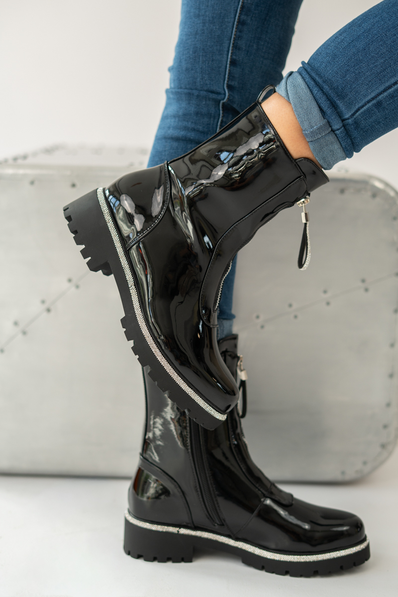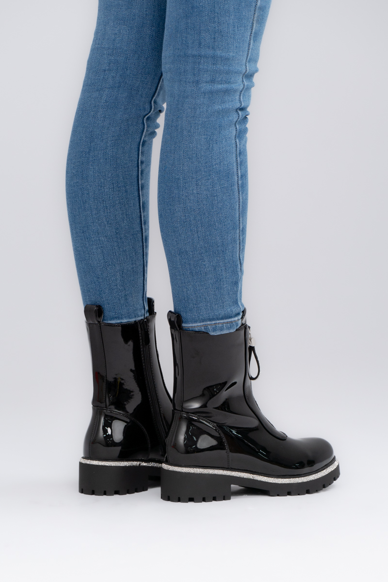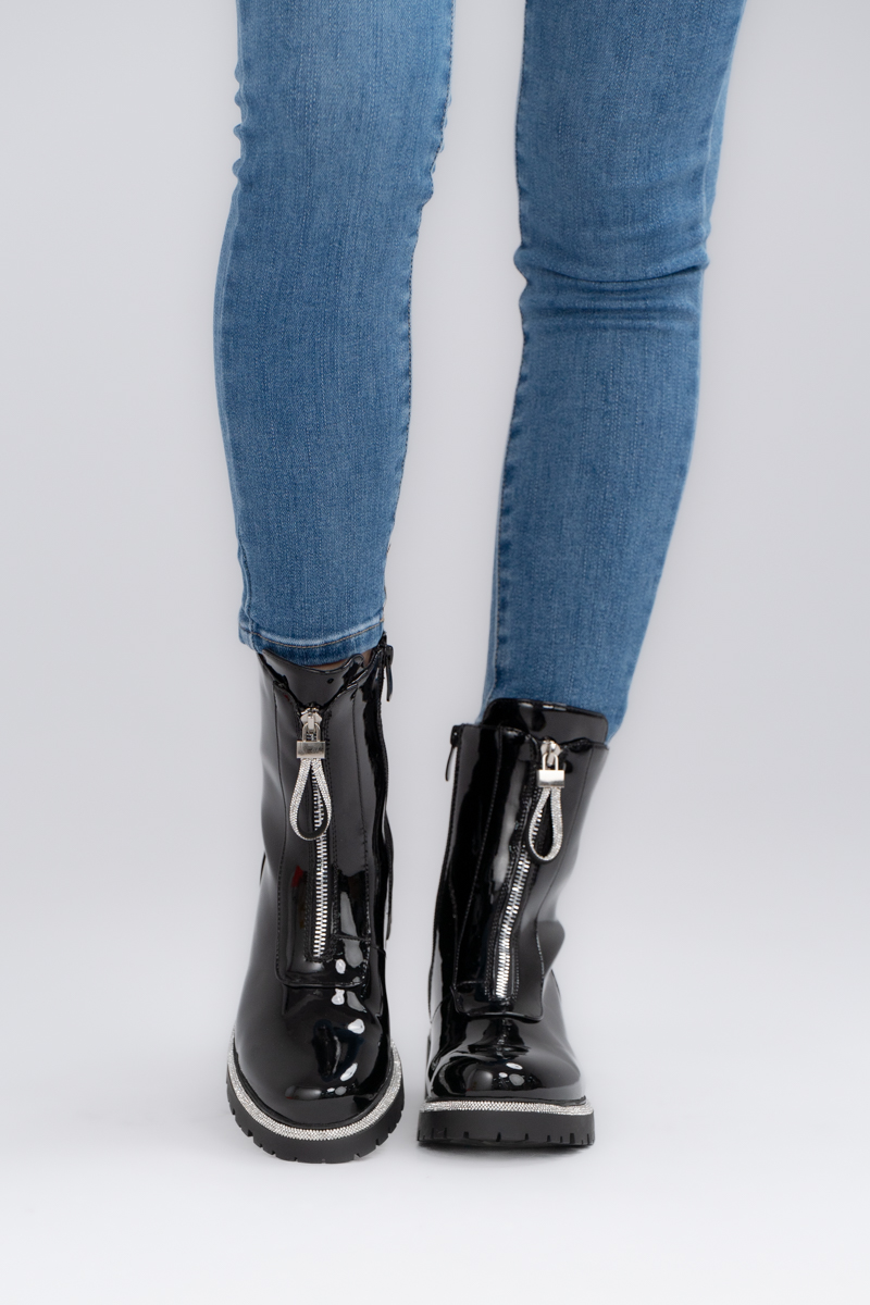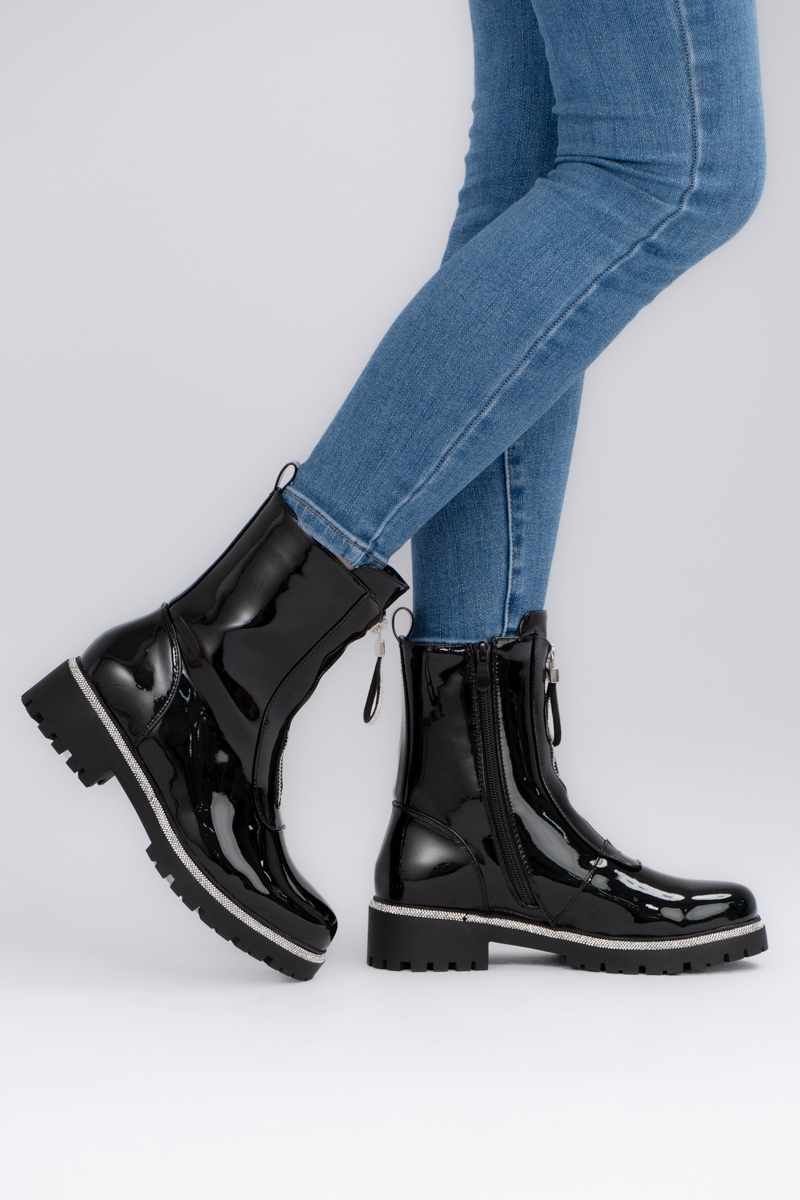 Botki z zamkiem z przodu czarne Corielle to stylowe i praktyczne obuwie na chłodniejsze dni. Wykonane z lakierowanego materiału, prezentują elegancki połysk, który dodaje charakteru każdej stylizacji. Wyposażone w ozdobny zamek z przodu, łączą nowoczesny design z wygodą użytkowania. Posiadają grubszą podeszwę z wyraźnym bieżnikiem, co zapewnia stabilność i komfort podczas chodzenia. Idealne zarówno do codziennych, jak i bardziej eleganckich zestawień, sprawdzą się w jesienno-zimowej garderobie.