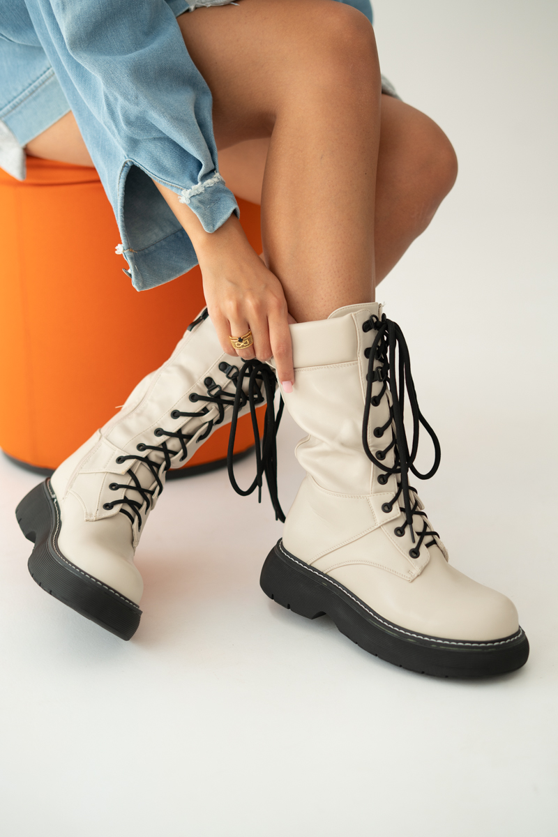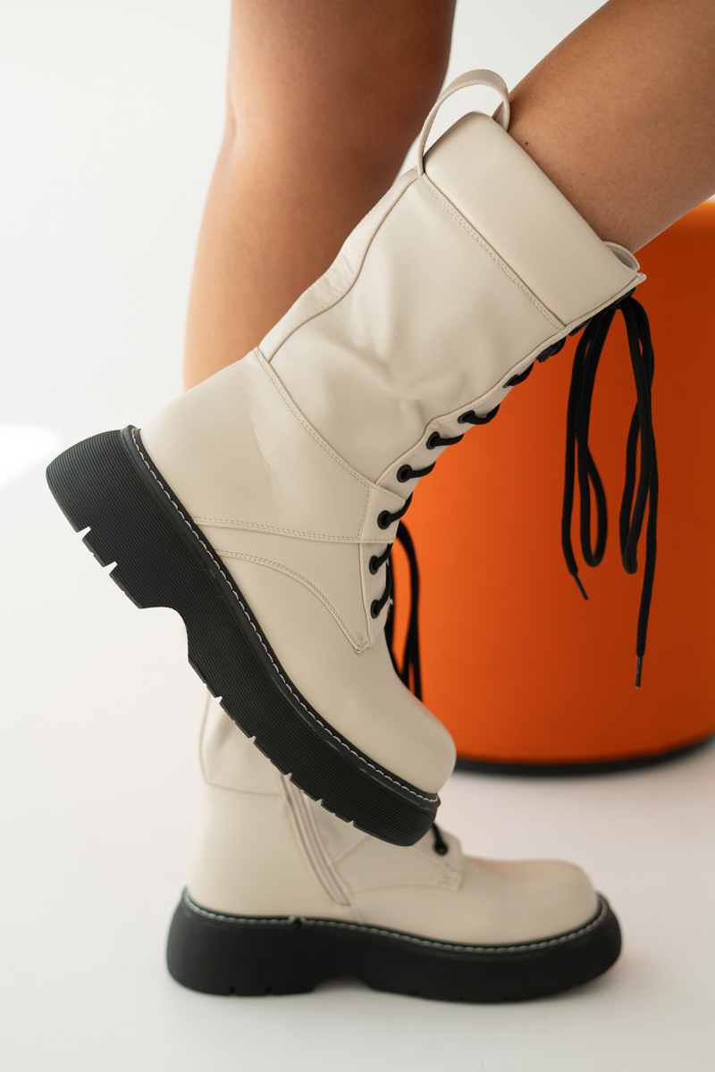 Martensy Veralyssa w kolorze beżowym to propozycja dla kobiet, które lubią mocny, wyrazisty styl. Wysoka cholewka z wiązaniem nadaje im charakteru, a kontrastowa czarna podeszwa z grubym bieżnikiem zapewnia stabilność i wygodę na co dzień. Suwak z boku ułatwia szybkie zakładanie, a solidne wykonanie sprawia, że buty świetnie sprawdzą się zarówno w miejskich, jak i bardziej casualowych stylizacjach. To must-have dla miłośniczek odważnej, streetwearowej mody.