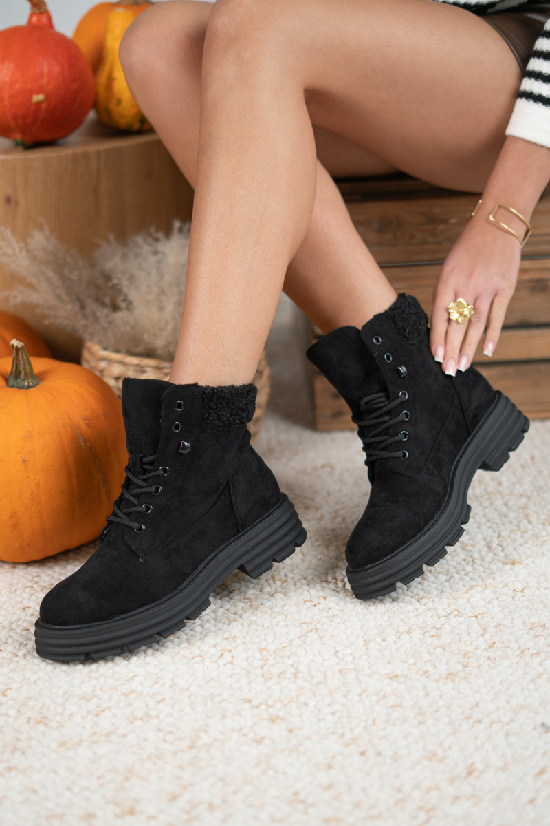 Trapery na grubej podeszwie z futerkiem Czarne – Calirene to idealne obuwie na chłodniejsze dni, łączące wygodę, praktyczność i modny wygląd. Wykonane z miękkiego materiału imitującego zamsz, prezentują się stylowo i elegancko, a ich klasyczna czerń sprawia, że pasują do wielu codziennych stylizacji. Buty zostały wyposażone w solidną, grubą podeszwę, która gwarantuje stabilność i dobrą przyczepność, nawet na śliskiej nawierzchni. Wnętrze ocieplone miękkim futerkiem zapewnia komfort termiczny i wygodę noszenia przez cały dzień. Sznurowanie pozwala idealnie dopasować buty do stopy, a jednocześnie nadaje im sportowo-miejskiego charakteru. Świetny wybór dla kobiet ceniących styl i komfort w jesienno-zimowych stylizacjach.
