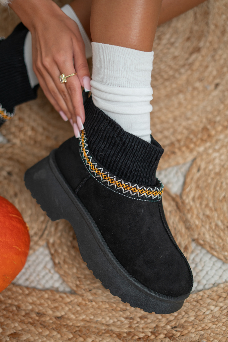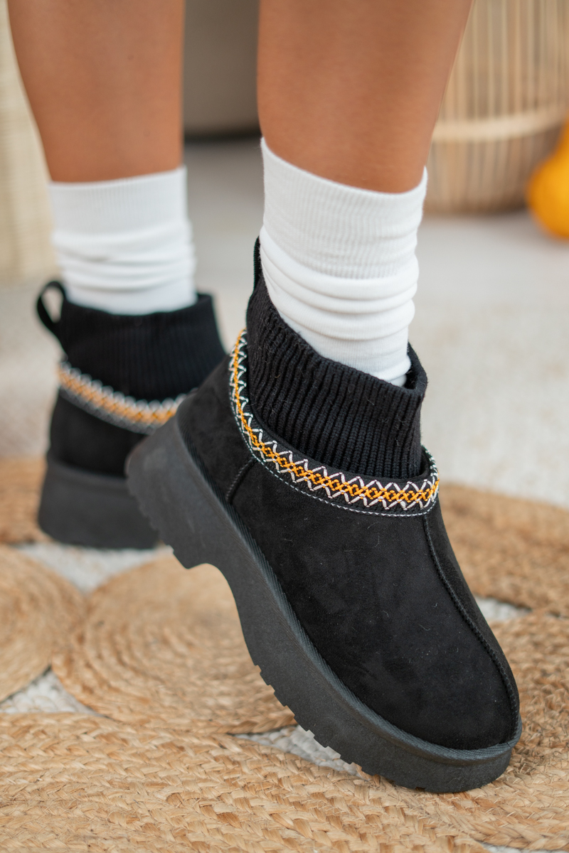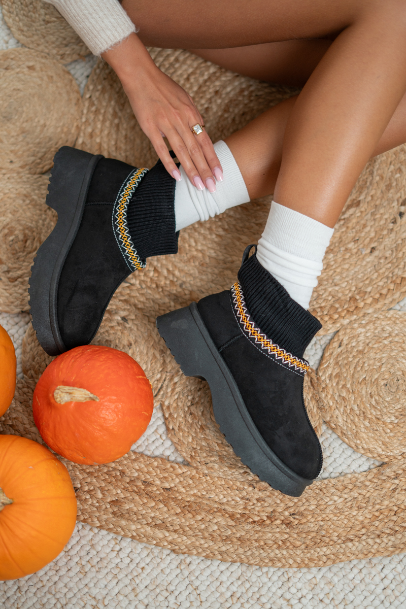 Niskie botki z obcasem na podeszwie Morivane w kolorze czarnym to połączenie nowoczesnego stylu i codziennej wygody. Wykonane z miękkiego, zamszowego materiału, prezentują się elegancko i modnie. Gruba, stabilna podeszwa z delikatnym obcasem zapewnia komfort noszenia oraz doskonałą przyczepność. Elastyczna, dzianinowa cholewka ułatwia zakładanie i dopasowuje się do stopy, a dekoracyjna taśma w stylu boho dodaje całości oryginalnego charakteru. To idealny wybór dla kobiet, które cenią wygodę, styl i odrobinę ekstrawagancji w codziennym obuwiu.