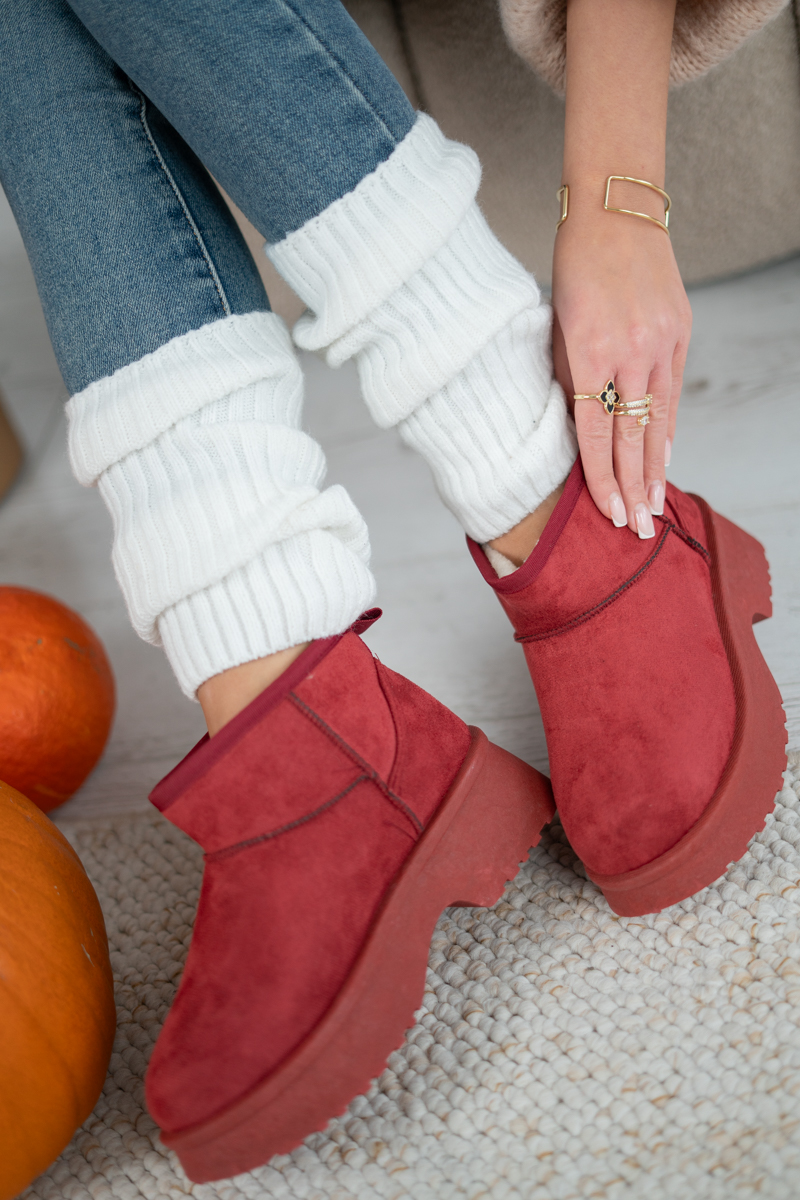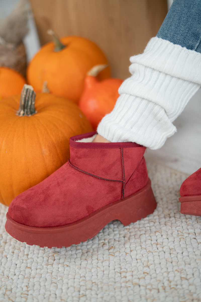Ocieplane śniegowce z podwyższoną podeszwą Frolyssa w kolorze bordowym to stylowy model, który łączy przytulność z nowoczesnym designem. Wykonane z miękkiego zamszowego materiału, zapewniają doskonały komfort termiczny i wygodę noszenia. Grubsza, podwyższona podeszwa dodaje im modnego charakteru oraz skutecznie chroni przed zimnem i wilgocią. Głęboki bordowy odcień dodaje elegancji i wyróżnia się na tle klasycznych zimowych butów. To idealny wybór dla kobiet, które chcą połączyć ciepło, wygodę i styl w jednym.