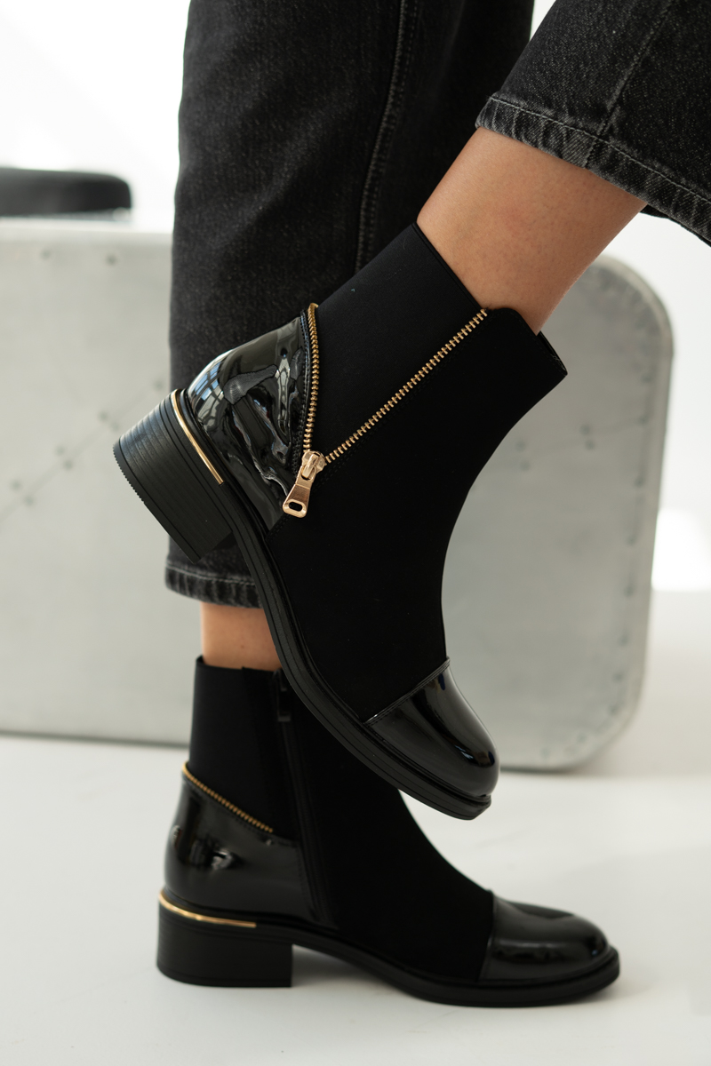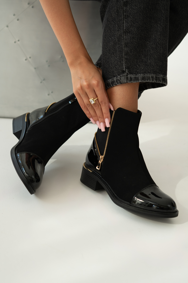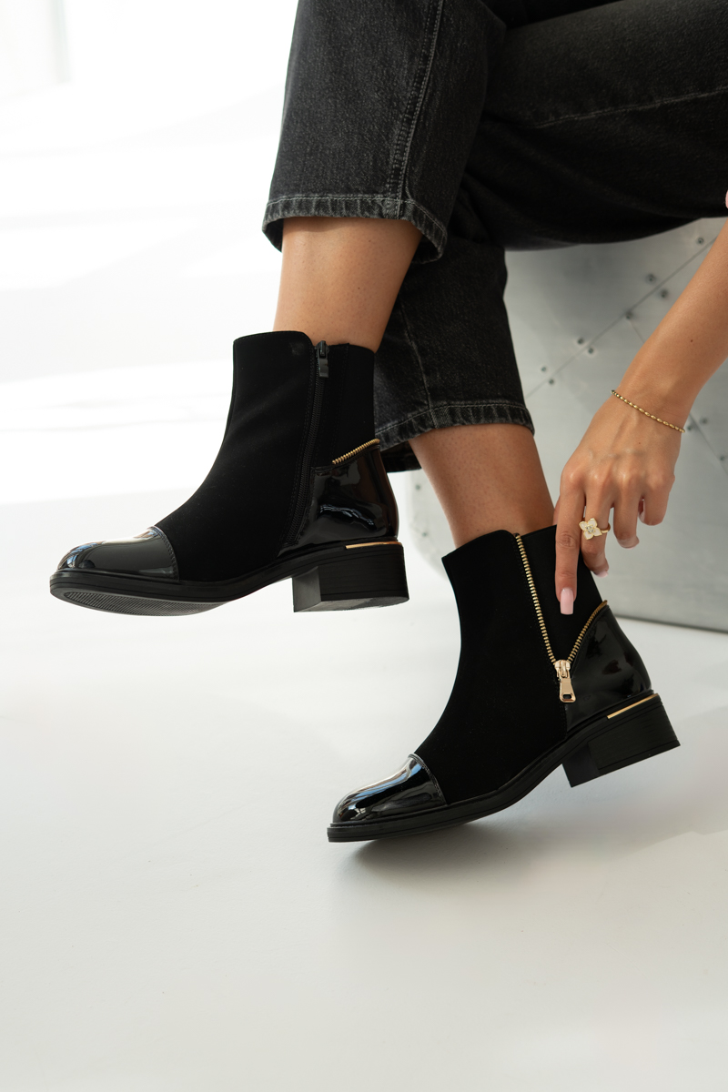 Botki ze złotym zamkiem z boku Czarne – Aurevia to elegancka propozycja dla kobiet ceniących klasykę z nutą nowoczesności. Połączenie matowego materiału z lakierowanymi wstawkami na nosku i pięcie nadaje im wyjątkowego charakteru. Złoty zamek po boku nie tylko ułatwia zakładanie, ale też pełni funkcję dekoracyjną, dodając szyku. Stabilny, niski obcas zapewnia wygodę podczas noszenia na co dzień. Idealne do stylizacji zarówno casualowych, jak i bardziej eleganckich.