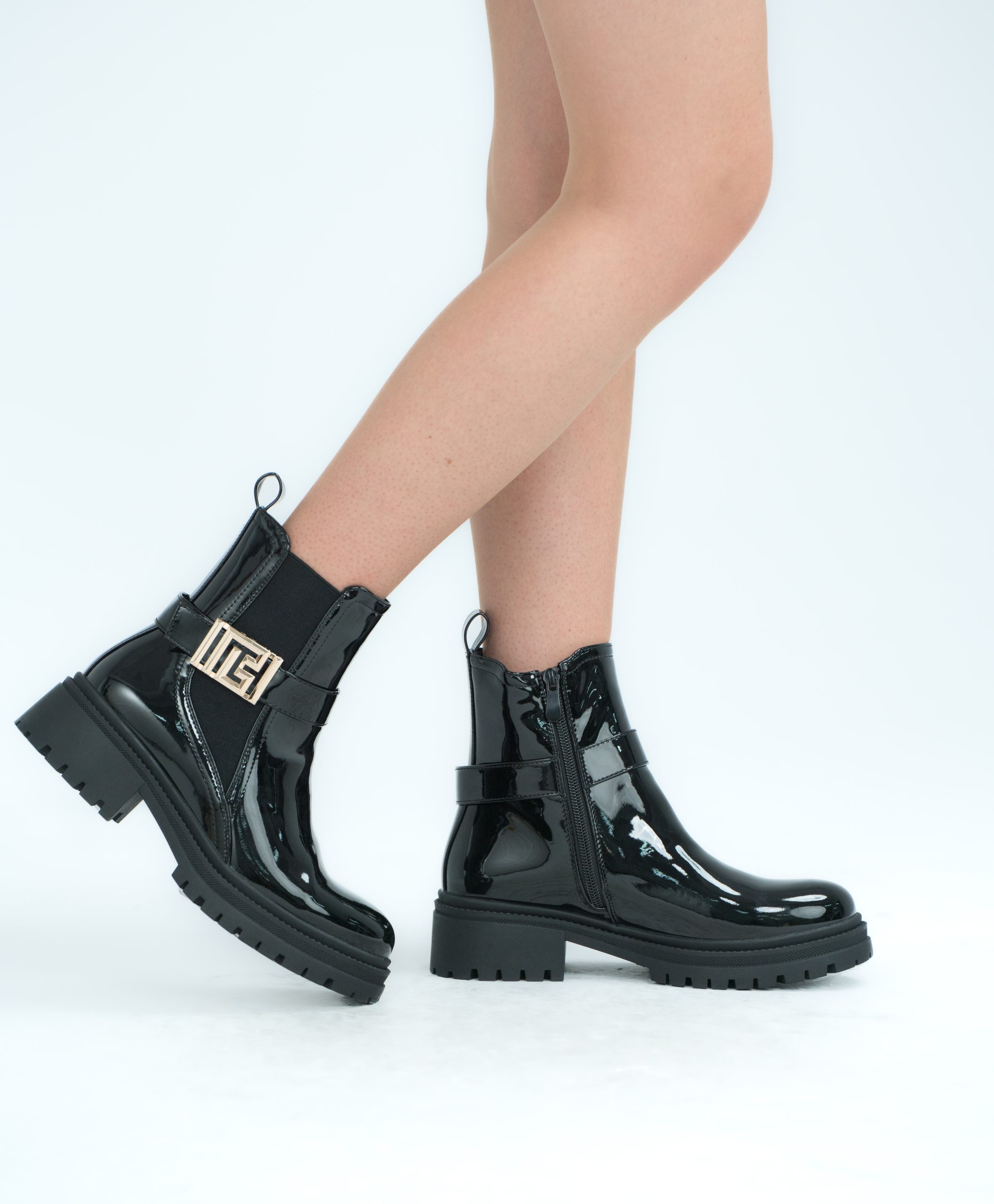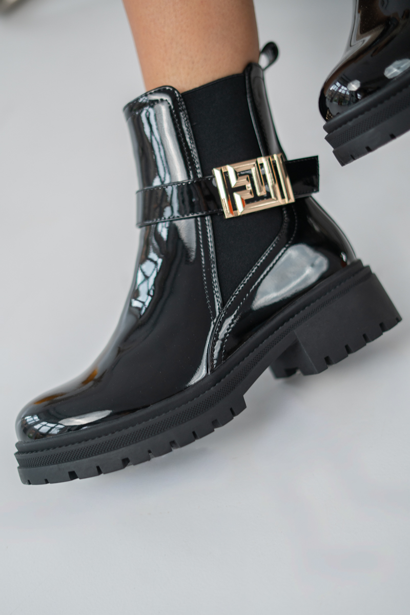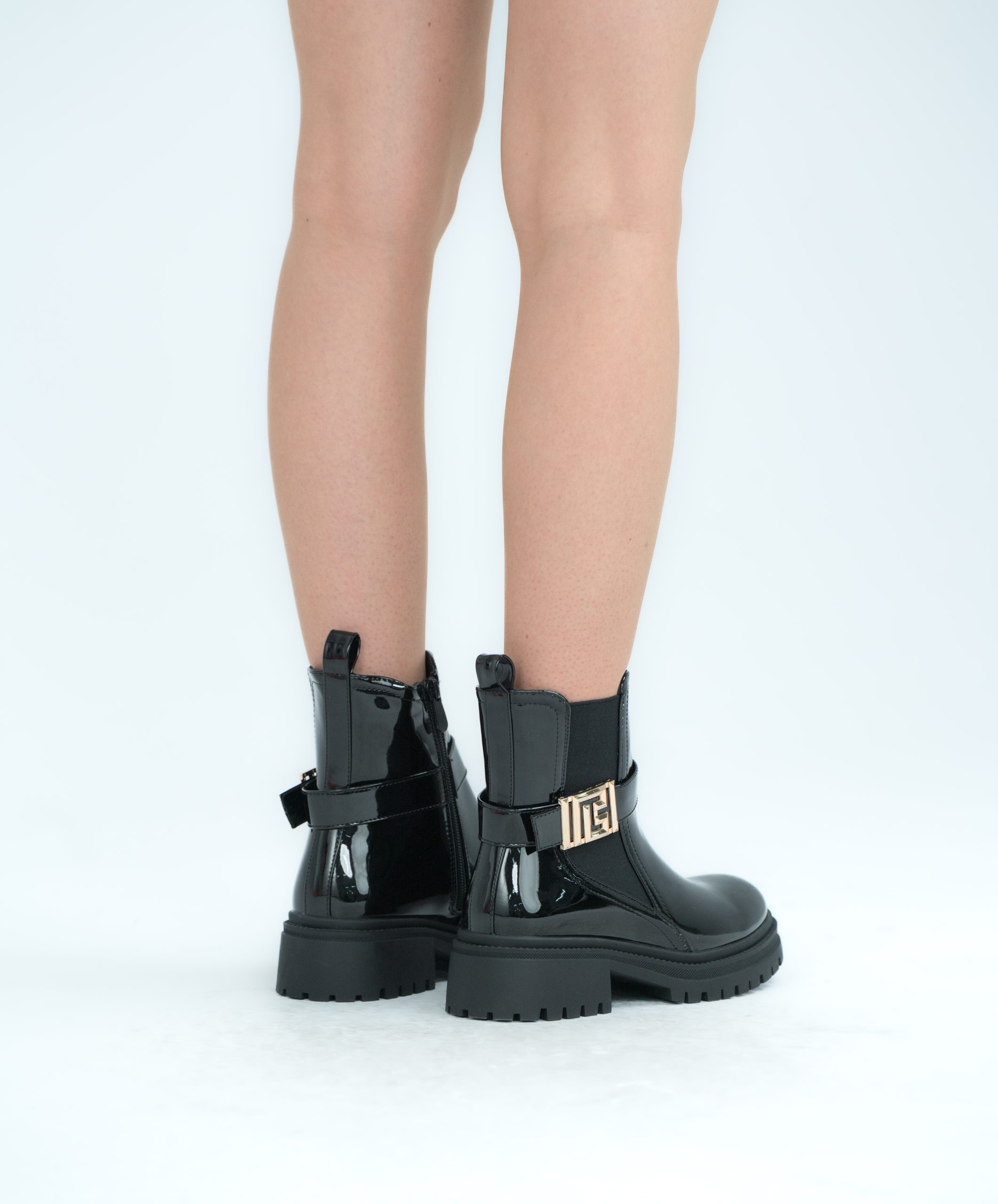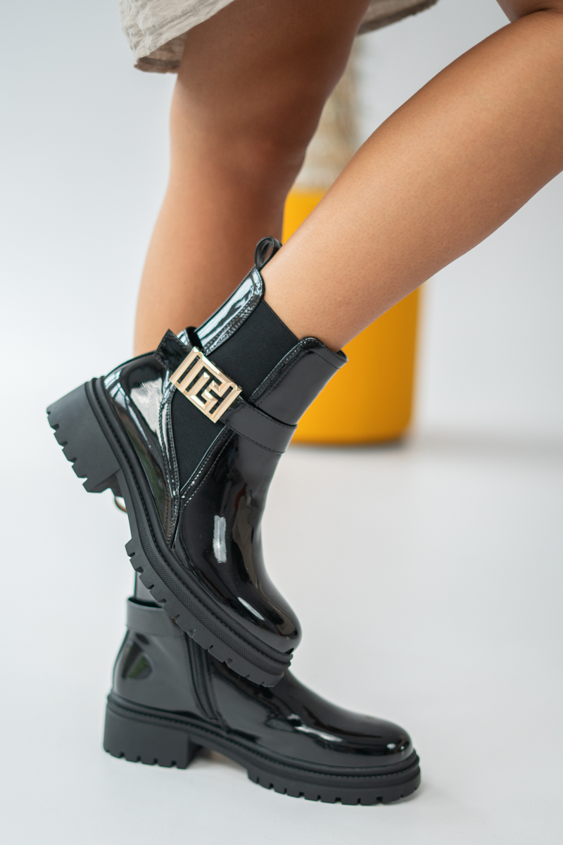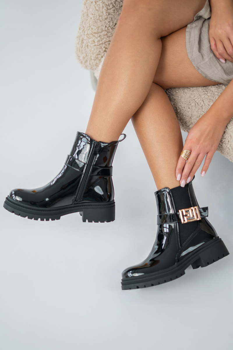 Lakierowane sztyblety na masywnej platformie ze złotą klamrą Czarne – Fiorane