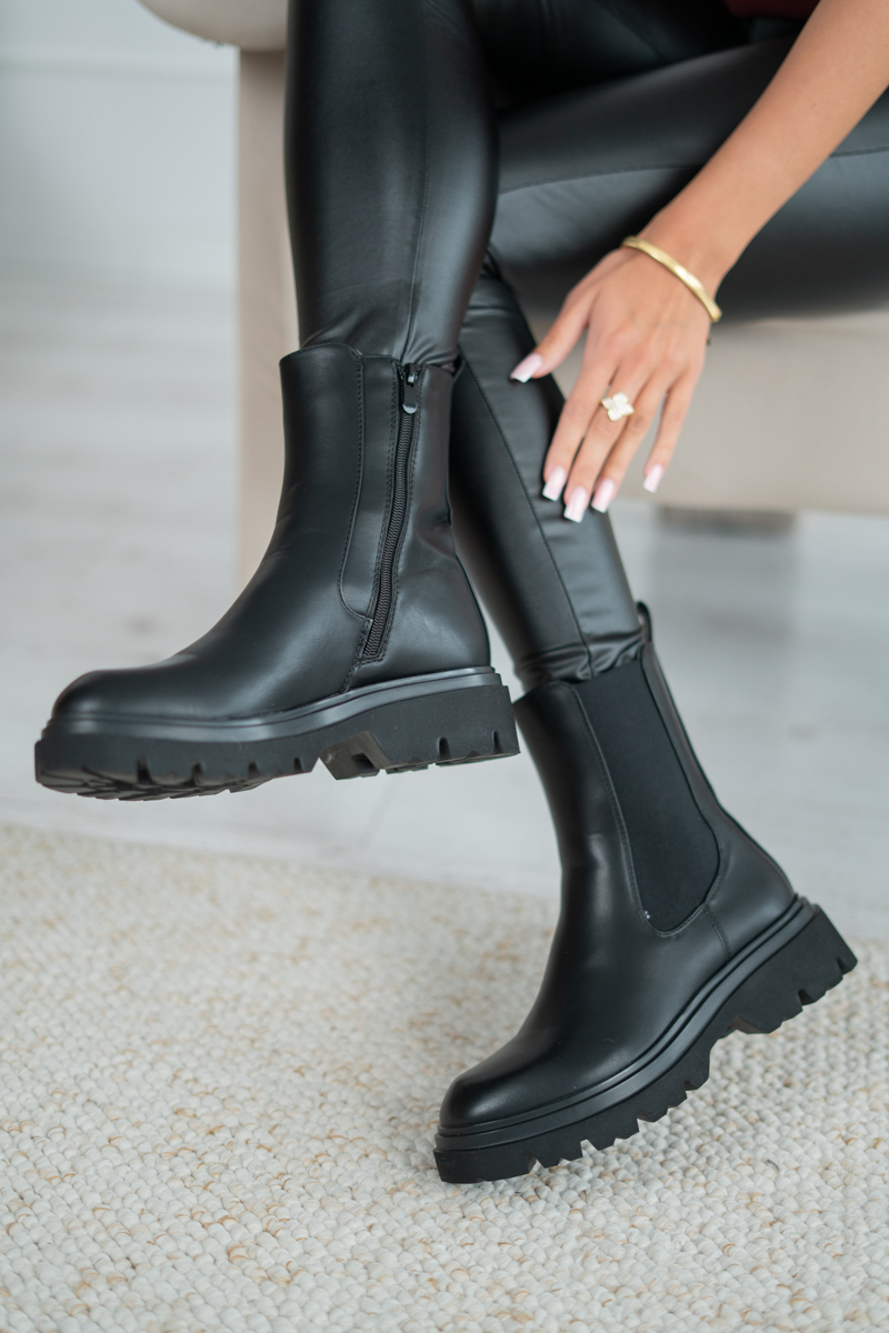 Sztyblety z gumką Veyrisse w kolorze czarnym to uniwersalny model, który łączy elegancję z nowoczesnym stylem. Wykonane z wysokiej jakości eko skóry, prezentują się minimalistycznie, a jednocześnie bardzo efektownie. Elastyczne panele po bokach gwarantują wygodne dopasowanie i łatwe zakładanie, natomiast masywna, traperowa podeszwa zapewnia stabilność i komfort użytkowania. To idealny wybór na co dzień – pasują zarówno do klasycznych płaszczy, jak i casualowych zestawów z jeansami czy ramoneską.