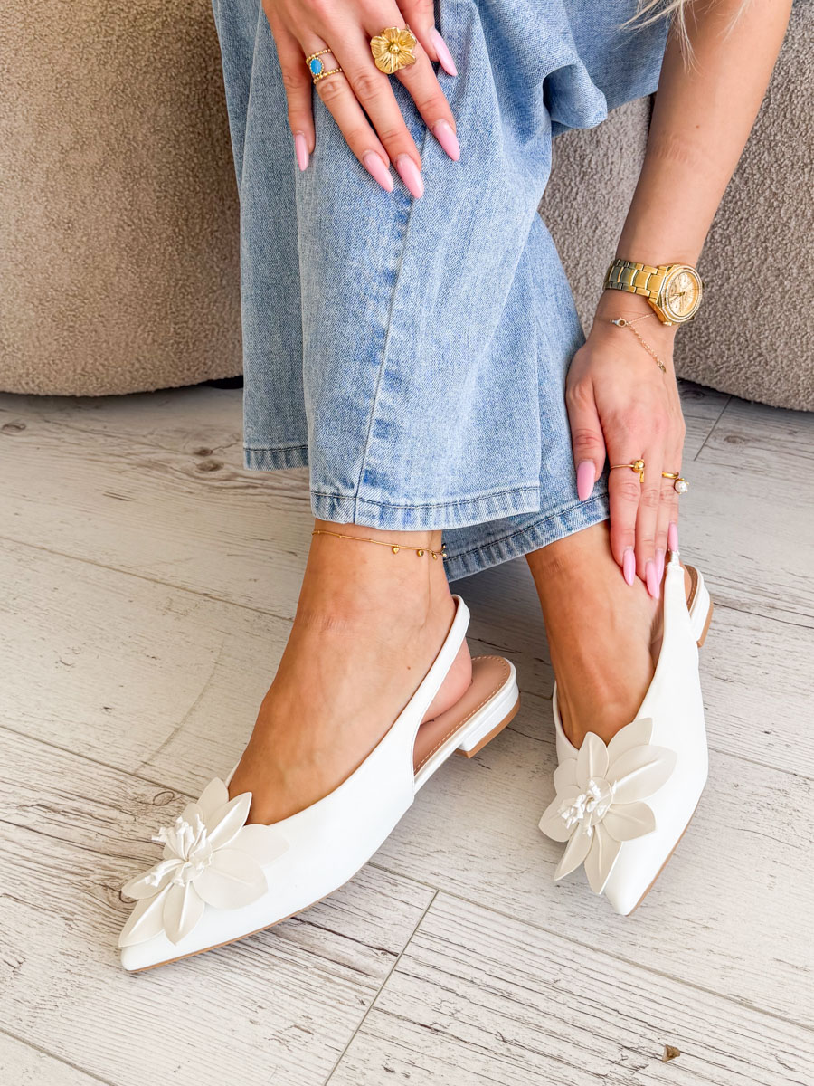 Czółenka z kwiatem slingback Białe – Flosling