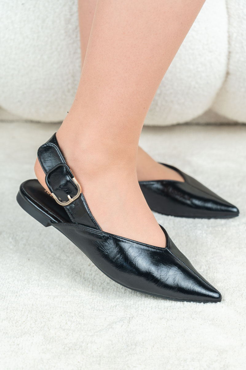 Eleganckie czółenka Anvera w klasycznej czerni to propozycja dla kobiet ceniących nowoczesny styl i wygodę. Lśniące wykończenie dodaje im szykownego charakteru, a odkryty tył i regulowany pasek zapinany na kostce zapewniają stabilne, indywidualne dopasowanie. Smukły, szpiczasty nosek podkreśla lekkość modelu, a płaska podeszwa gwarantuje komfort podczas całodziennego noszenia. To uniwersalne obuwie, które świetnie dopełni zarówno eleganckie, jak i codzienne stylizacje.
