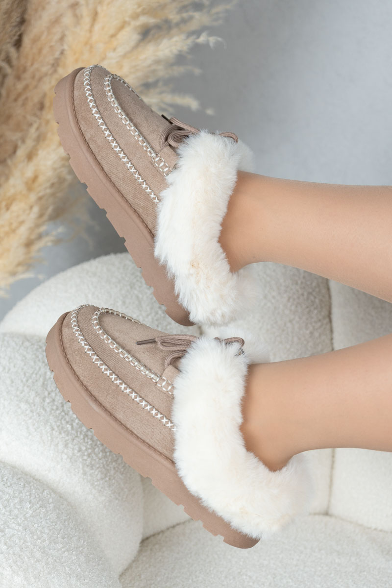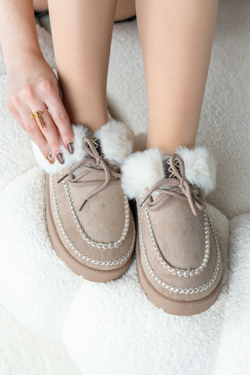 Wsuwane buty z futerkiem Elyssira w odcieniu fango to doskonała propozycja na chłodniejsze dni dla osób ceniących wygodę i ciepło. Ich miękka, zamszowa cholewka prezentuje przyjemnie matowe wykończenie, a puszyste ocieplenie wewnętrzne zapewnia komfort przy każdym kroku. Charakterystyczne przeszycia nadają modelowi stylowego, zimowego wyglądu, a solidna, podwyższona podeszwa gwarantuje stabilność podczas codziennego użytkowania. Wsuwana konstrukcja ułatwia szybkie zakładanie. To idealne obuwie do casualowych zimowych stylizacji, łączące funkcjonalność z modnym designem.