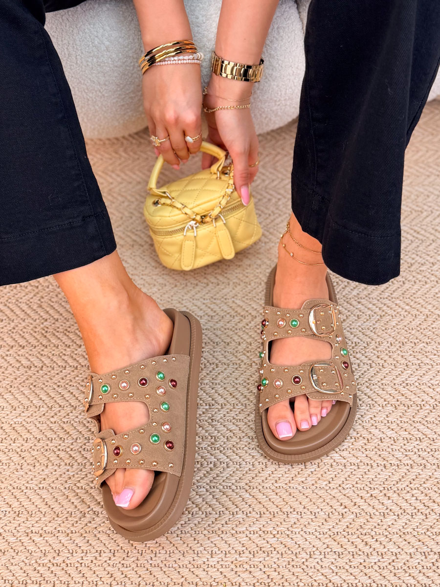 Klapki Suede Glow w odcieniu fango to doskonałe połączenie stonowanej elegancji i codziennej wygody. Wykonane z miękkiego materiału o zamszowym wykończeniu, prezentują się subtelnie i stylowo. Dwa szerokie paski z regulowanymi klamrami umożliwiają indywidualne dopasowanie do stopy, zapewniając stabilność i komfort noszenia. Ozdobne dżety dodają delikatnego blasku i modnego charakteru, wyróżniając ten model na tle klasycznych klapków. Profilowana podeszwa zwiększa wygodę użytkowania przez cały dzień. Idealne do letnich stylizacji – lekkie, uniwersalne i efektowne.