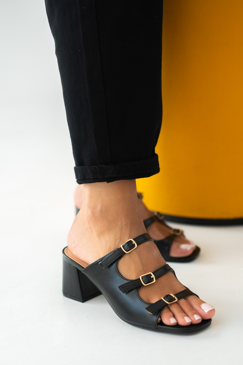 Stylowe klapki na obcasie w kolorze czarnym to elegancka propozycja dla kobiet ceniących wygodę połączoną z modnym wyglądem. Wykonane z wysokiej jakości materiału, prezentują się szykownie i są komfortowe w noszeniu. Stabilny, szeroki obcas zapewnia wygodę podczas chodzenia, a trzy regulowane paski z metalowymi sprzączkami nadają butom charakteru oraz umożliwiają idealne dopasowanie do stopy. Klasyczna czerń sprawia, że klapki pasują zarówno do casualowych, jak i eleganckich stylizacji – świetnie komponują się z sukienką, spódnicą czy spodniami. To doskonały wybór na lato dla kobiet lubiących styl i komfort.