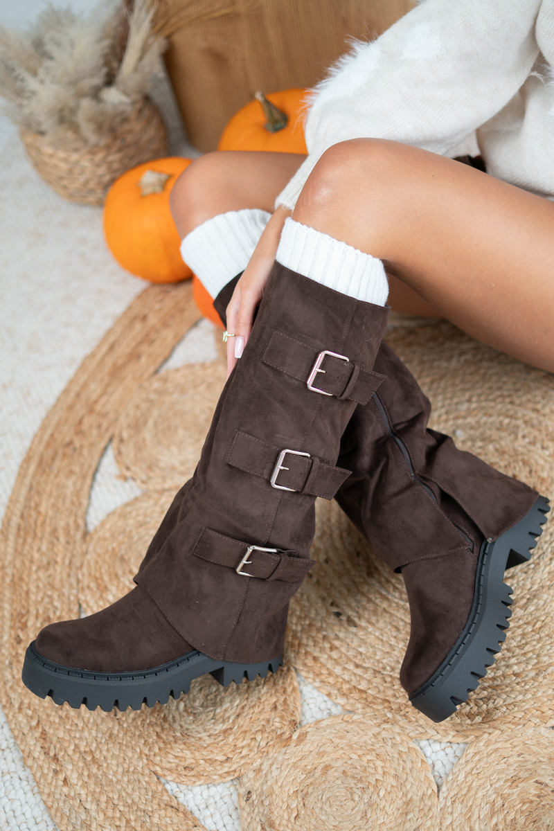 Kozaki damskie na traperze z klamrami Czekoladowy – Travorra