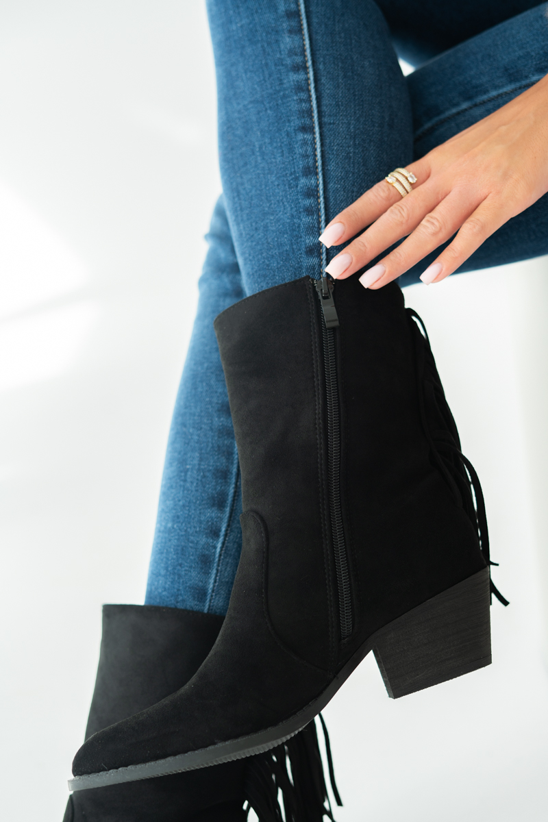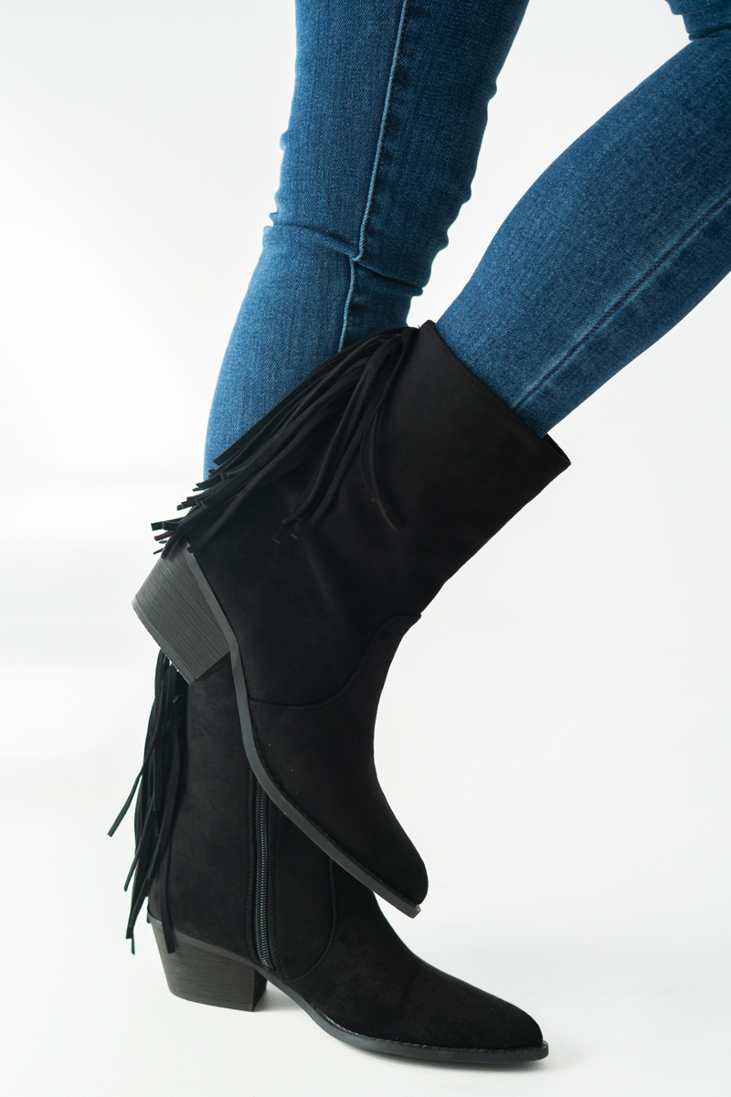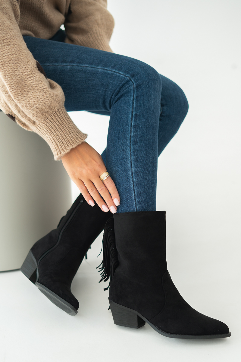 Jesienne botki damskie Czarne to eleganckie i stylowe obuwie, idealne na sezon przejściowy. Wykonane z miękkiego materiału o zamszowej fakturze, prezentują się nowocześnie i ponadczasowo w klasycznej czerni. Osadzone na stabilnym, skośnym obcasie zapewniają wygodę oraz optyczne wysmuklenie sylwetki. Charakterystycznym detalem są ozdobne frędzle po bokach, które nadają butom modnego, boho-westernowego charakteru. To uniwersalny model, który świetnie komponuje się zarówno z jeansami, jak i sukienkami czy spódnicami, dodając stylizacji wyjątkowego, jesiennego uroku.