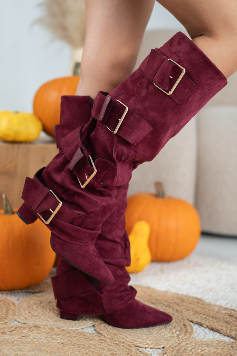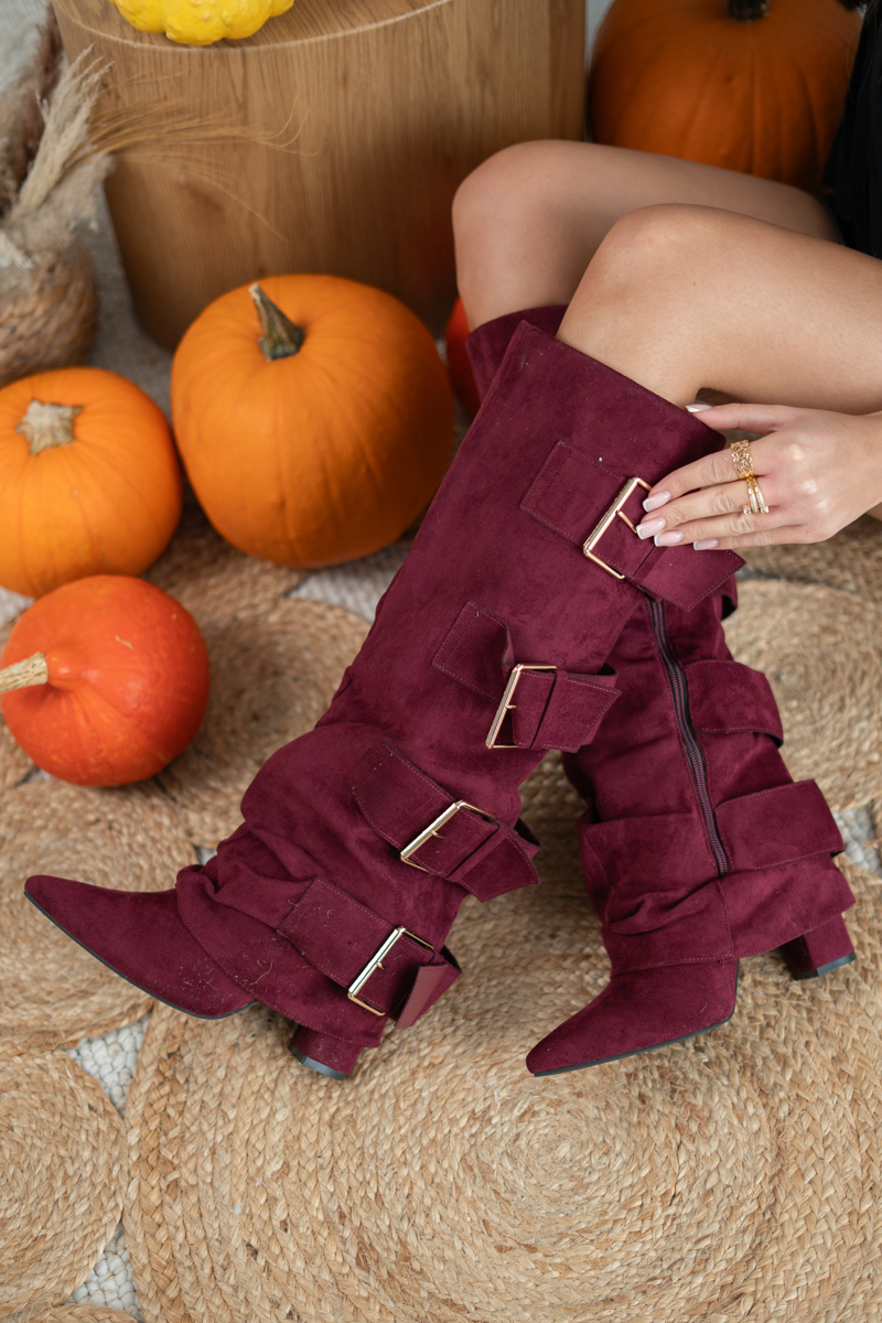 Kozaki damskie zamszowe z klamrami Bordowy – Falirra