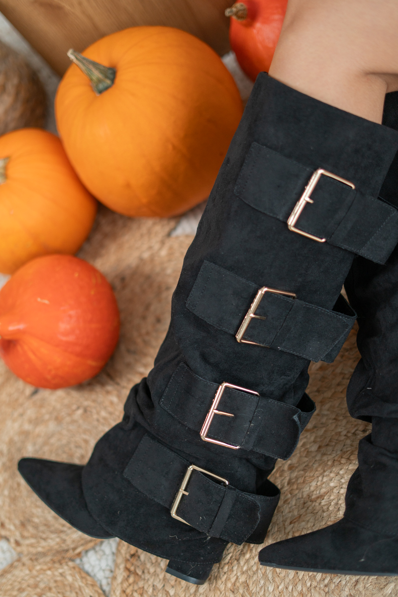 Kozaki damskie zamszowe z klamrami Czarny – Falirra
