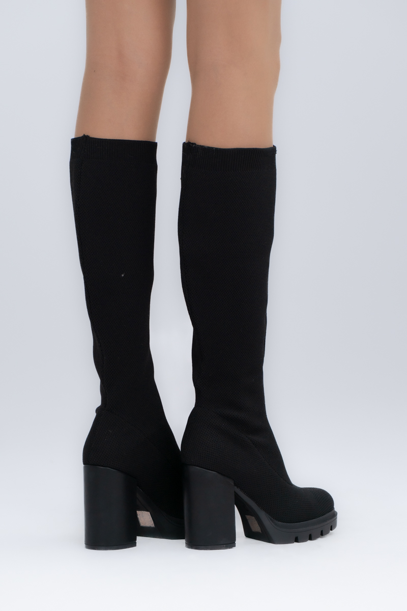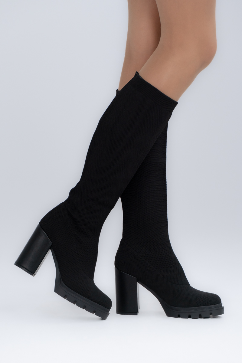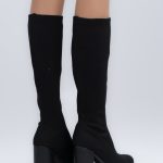 Kozaki z dopasowaną cholewką w kolorze czarnym to eleganckie i nowoczesne obuwie, które pięknie podkreśla sylwetkę. Wykonane z elastycznego materiału, idealnie dopasowują się do nogi, zapewniając komfort i stylowy wygląd. Wysoki, stabilny obcas w połączeniu z solidną platformą gwarantuje wygodę oraz subtelne wysmuklenie sylwetki. Klasyczna, prosta linia bez zbędnych ozdób sprawia, że kozaki prezentują się minimalistycznie i ponadczasowo. Uniwersalna czerń doskonale komponuje się z eleganckimi sukienkami, spódnicami czy dopasowanymi spodniami, czyniąc je idealnym wyborem na jesienne i zimowe stylizacje.