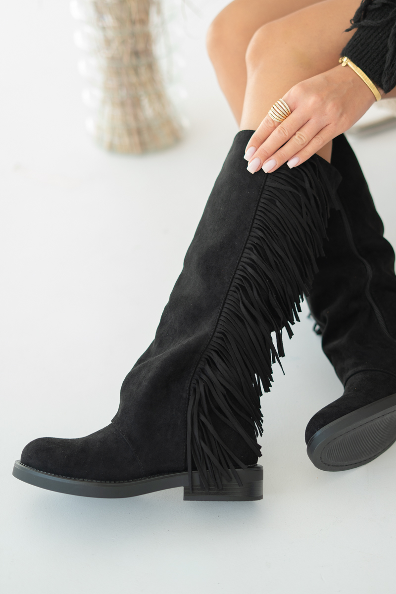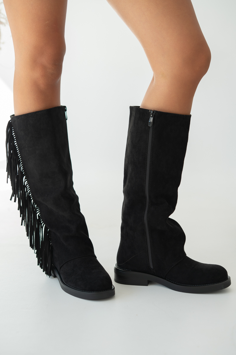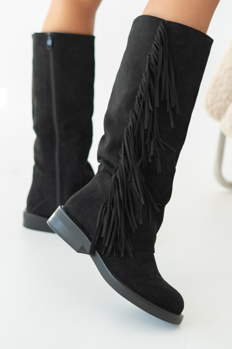 Kozaki damskie z frędzlami na płaskiej podeszwie Czarne – Cylianne