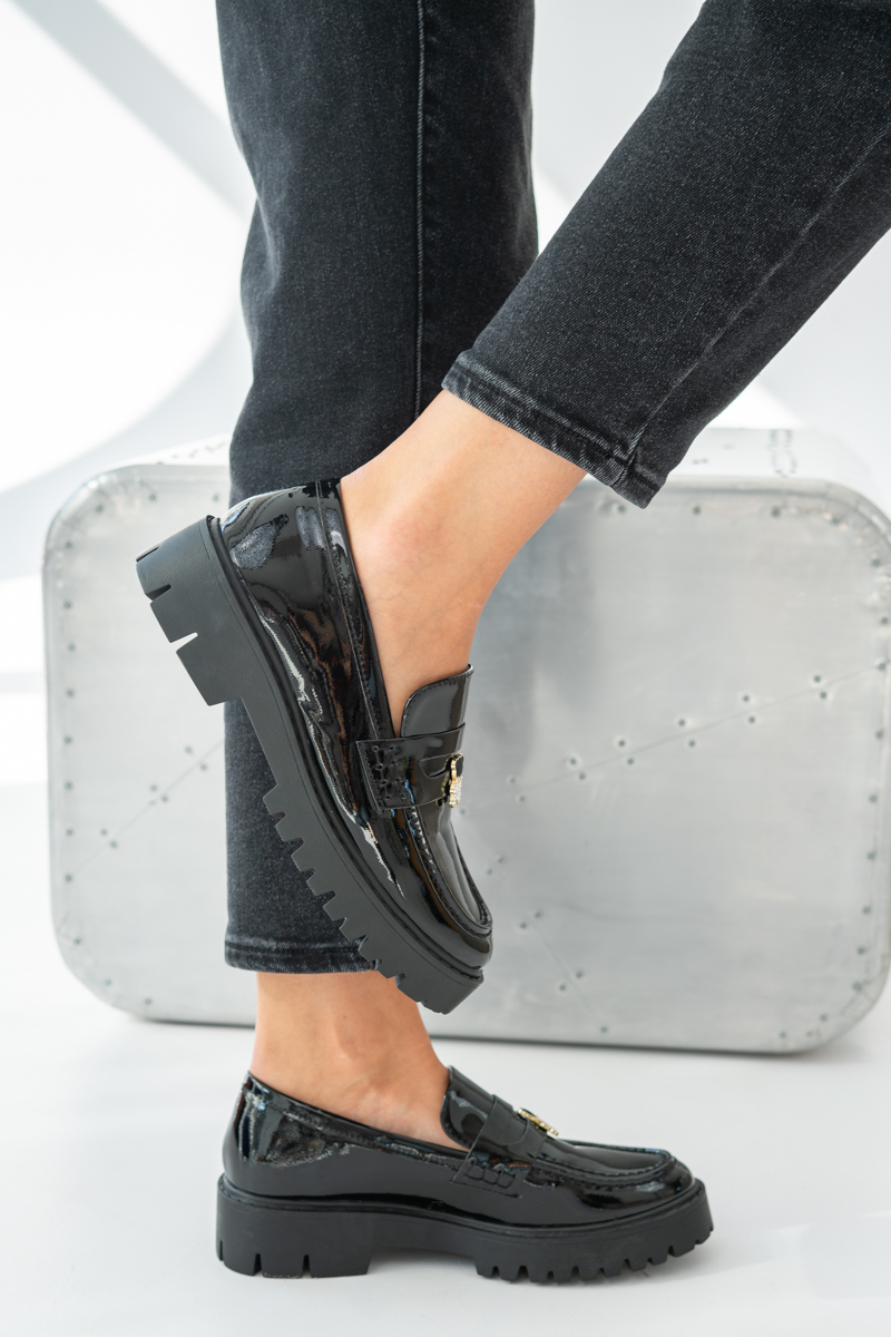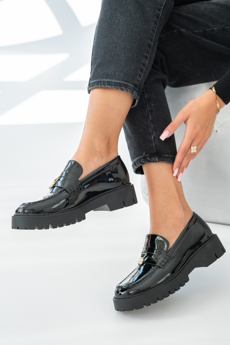 Czarne loafersy damskie Cudivra to eleganckie obuwie z nutą oryginalności. Wykonane z lakierowanej ekoskóry, przyciągają uwagę subtelnym połyskiem i klasycznym fasonem osadzonym na grubszej podeszwie, która zapewnia wygodę i stabilność. Charakterystycznym elementem jest złota ozdoba w kształcie misia wysadzanego cyrkoniami, dodająca butom uroku i wyjątkowego charakteru. Dzięki połączeniu elegancji i dziewczęcego detalu loafersy świetnie sprawdzą się zarówno w codziennych, jak i bardziej szykownych stylizacjach. To propozycja dla kobiet, które chcą wyróżnić się stylem, nie rezygnując z komfortu.