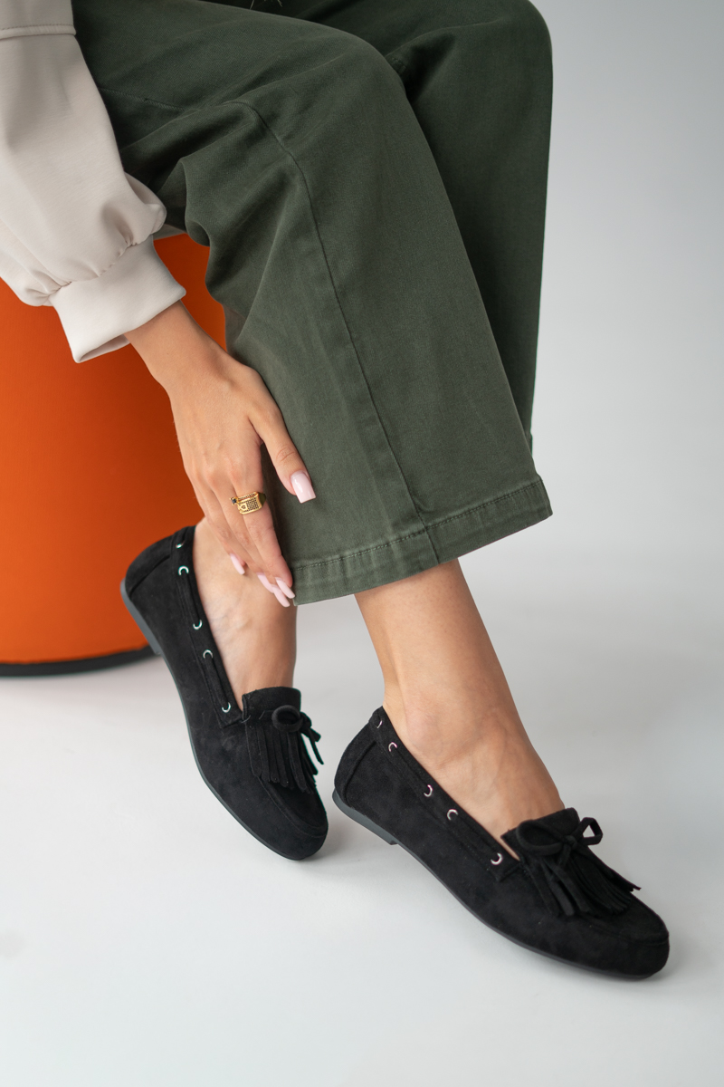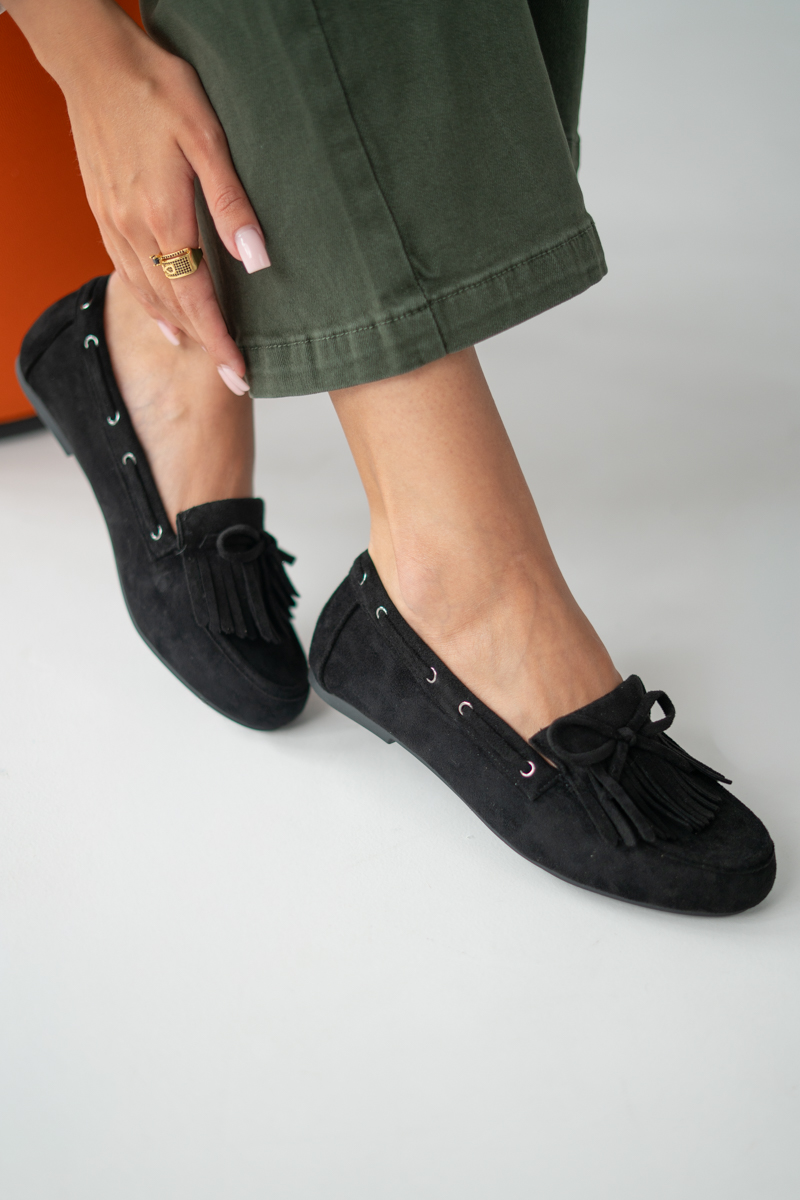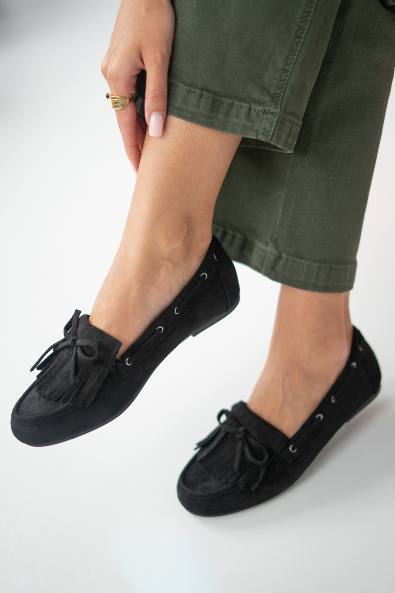 Mokasyny Lovira w kolorze czarnym to klasyczne obuwie, które sprawdzi się na co dzień i w bardziej eleganckich stylizacjach. Ich prosty fason został urozmaicony ozdobnymi frędzlami oraz delikatnym wiązaniem, co dodaje im charakteru. Miękka cholewka i płaska podeszwa zapewniają komfort noszenia przez cały dzień. Idealne do spodni, sukienek czy spódnic – uniwersalne i zawsze w dobrym stylu.