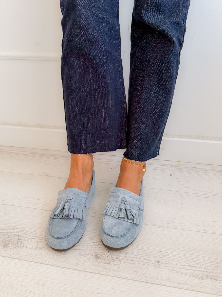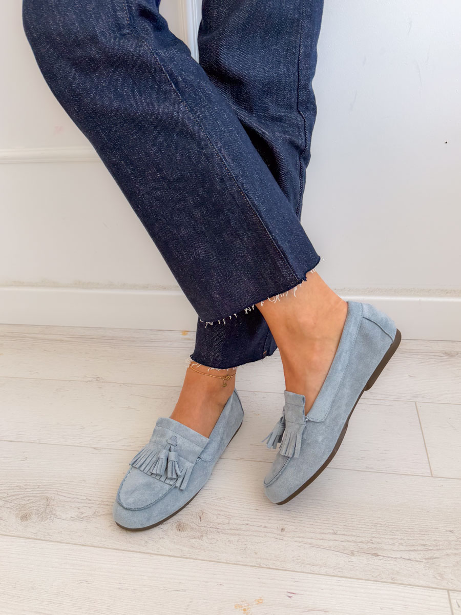 Błękitne mokasyny Franjela to stylowa i wygodna propozycja na co dzień. Wykonane z miękkiego zamszu, doskonale dopasowują się do stopy, zapewniając komfort noszenia przez cały dzień. Klasyczny fason uzupełniony został ozdobnymi frędzlami z przodu, które nadają butom subtelnego, modnego charakteru. Wsuwana konstrukcja ułatwia zakładanie, a płaska podeszwa sprawdzi się zarówno podczas spacerów, jak i w pracy. Delikatny błękit pięknie ożywia stylizacje i świetnie komponuje się z jeansami, cygaretkami czy lekkimi sukienkami. To uniwersalny model dla kobiet ceniących wygodę i elegancję w casualowym wydaniu.