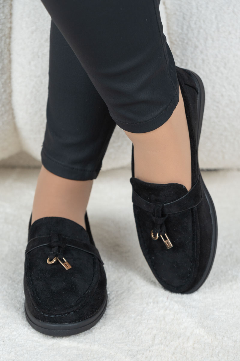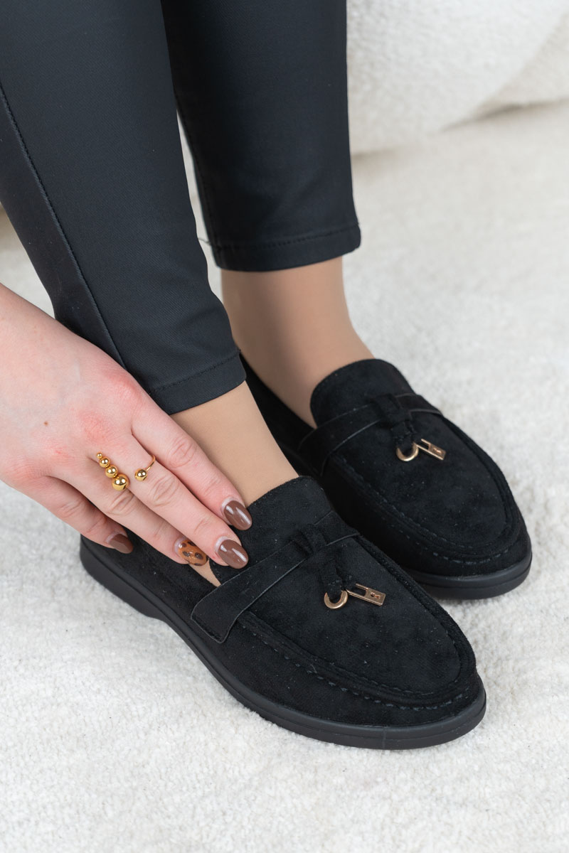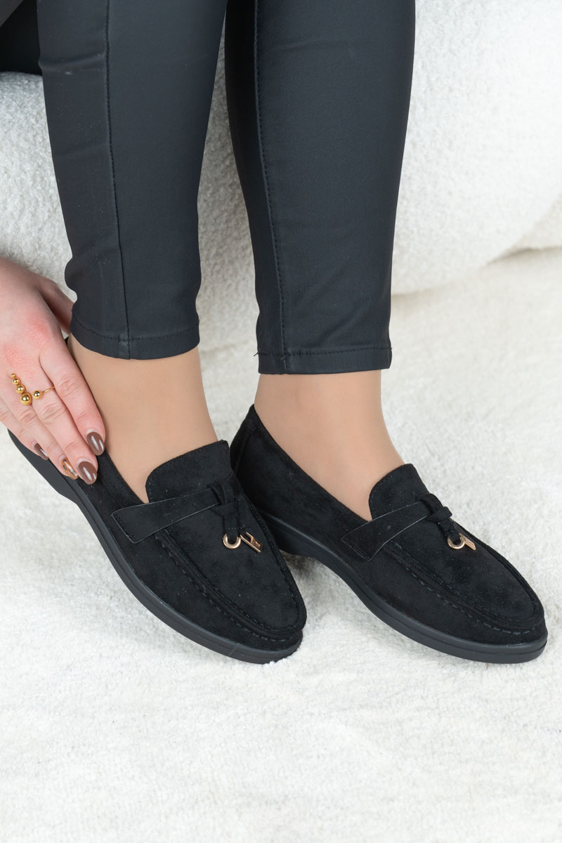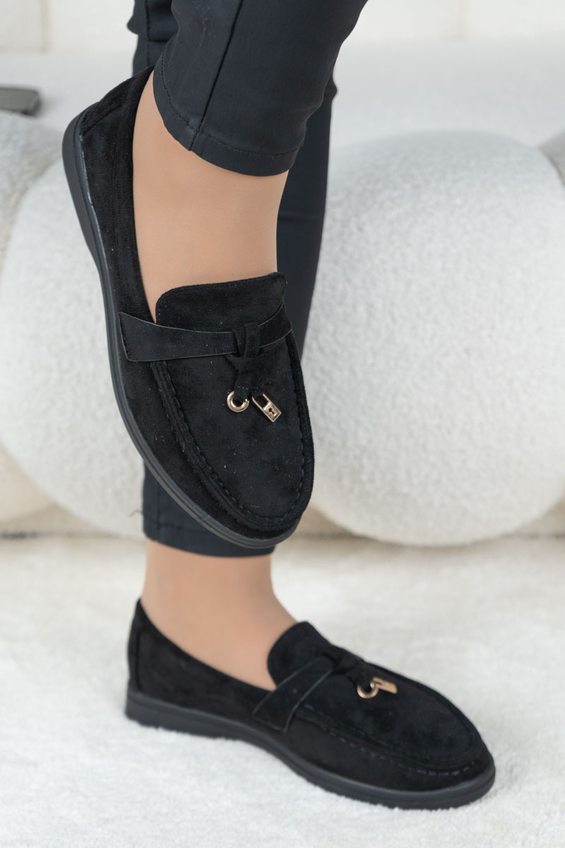 Zamszowe mokasyny na płaskiej podeszwie w kolorze czarnym to elegancki i ponadczasowy model, który sprawdzi się w wielu stylizacjach. Wykonane z miękkiego materiału o zamszowym wykończeniu prezentują się szykownie i klasycznie. Płaska, elastyczna podeszwa zapewnia wygodę noszenia, a ozdobny detal na przyszwie dodaje im stylowego charakteru. Klasyczna czerń sprawia, że mokasyny świetnie komponują się zarówno z codziennymi zestawami, jak i z bardziej eleganckimi stylizacjami. To praktyczne obuwie, które łączy komfort i elegancję.