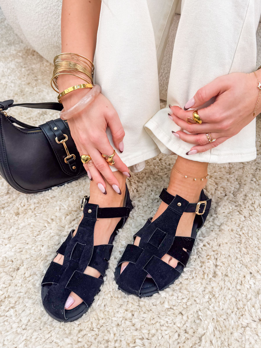 Płaskie sandały w stylu rzymianek w czarnym kolorze to ponadczasowa propozycja na wiosenno-letni sezon, łącząca klasyczny design z wygodą noszenia. Charakterystyczne paski subtelnie oplatają stopę, zapewniając stabilność i dobre dopasowanie, a regulowane zapięcie na sprzączkę pozwala idealnie dopasować obuwie do kostki. Minimalistyczna, płaska podeszwa gwarantuje komfort nawet podczas dłuższego użytkowania, dzięki czemu model świetnie sprawdzi się na co dzień. Te sandały doskonale uzupełnią zarówno casualowe stylizacje z szortami czy jeansami, jak i lekkie letnie sukienki, dodając im wyrazistego, a jednocześnie uniwersalnego charakteru.