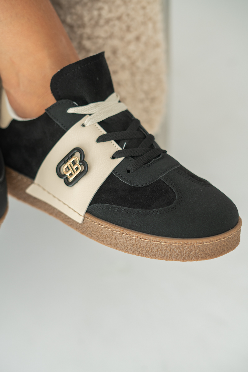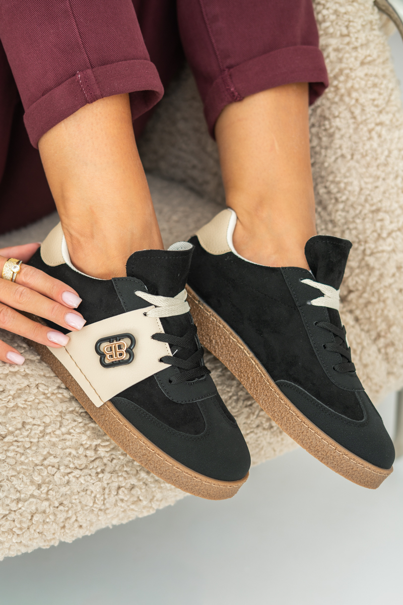 Buty sportowe damskie zamszowe Czarne to stylowe i wygodne obuwie idealne na co dzień. Wykonane z miękkiego ekologicznego zamszu w klasycznej czerni, zostały urozmaicone beżowymi wstawkami, które dodają im modnego kontrastu. Lekka, gumowa podeszwa w naturalnym odcieniu zapewnia komfort i stabilność podczas chodzenia, a tradycyjne sznurowanie umożliwia idealne dopasowanie do stopy. Dzięki swojemu casualowemu charakterowi buty świetnie sprawdzą się zarówno w codziennych stylizacjach z jeansami, jak i w bardziej sportowych zestawach. To uniwersalny model dla kobiet ceniących połączenie wygody i nowoczesnego designu.