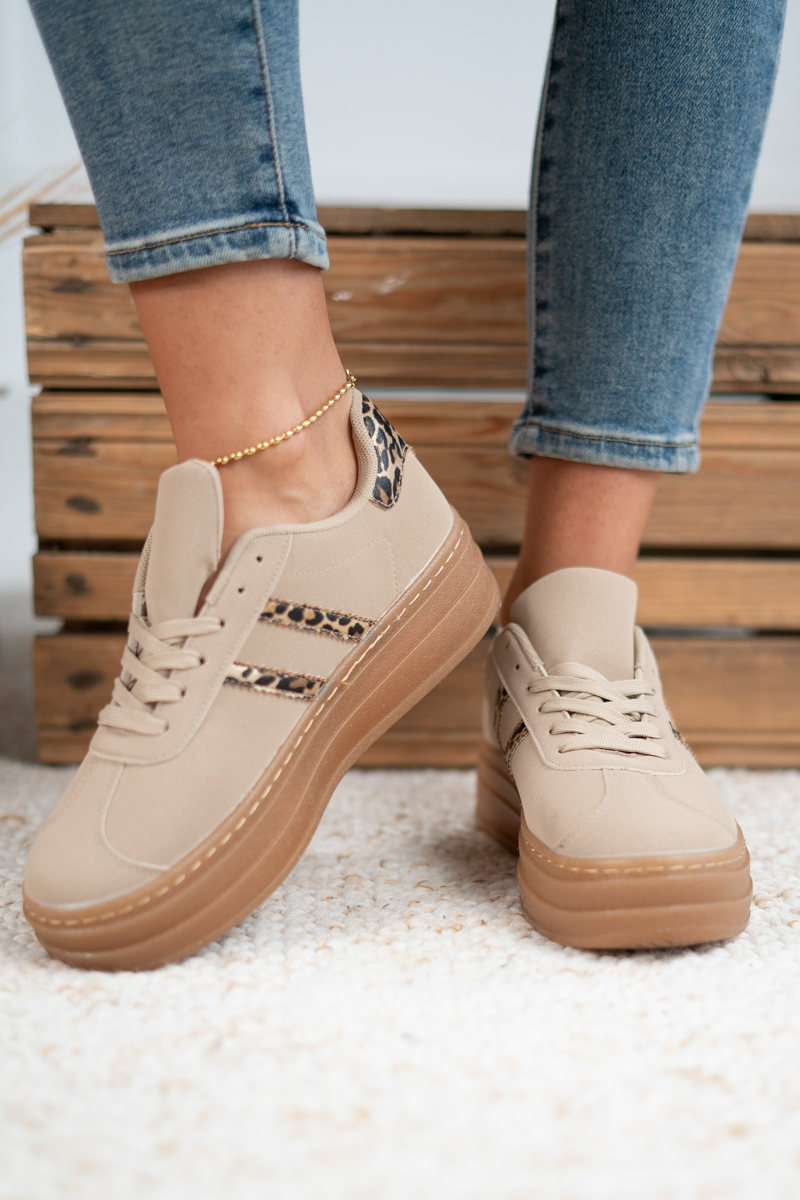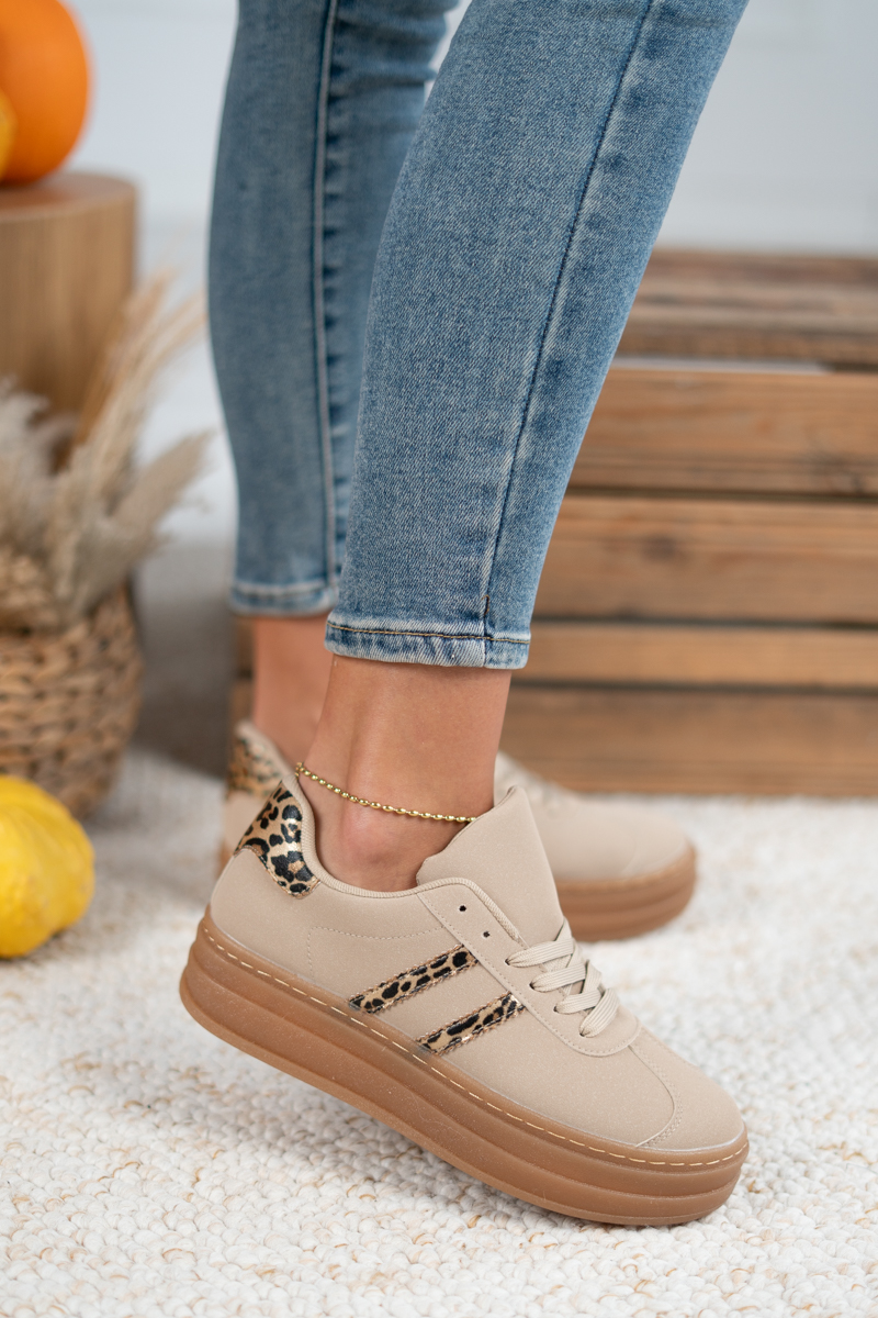 Damskie sneakersy na platformie Zevoria w kolorze fango to modne i wygodne obuwie, idealne na co dzień. Wykonane z wysokiej jakości materiału imitującego skórę, zachwycają prostym, a zarazem stylowym designem. Ciepły, ziemisty odcień fango doskonale komponuje się z neutralnymi stylizacjami, a gruba, kontrastowa podeszwa zapewnia stabilność i wygodę przy każdym kroku. Platforma subtelnie wydłuża sylwetkę, dodając butom nowoczesnego charakteru. To idealny wybór dla kobiet, które szukają połączenia casualowego stylu, funkcjonalności i modnego wyglądu w jednym.