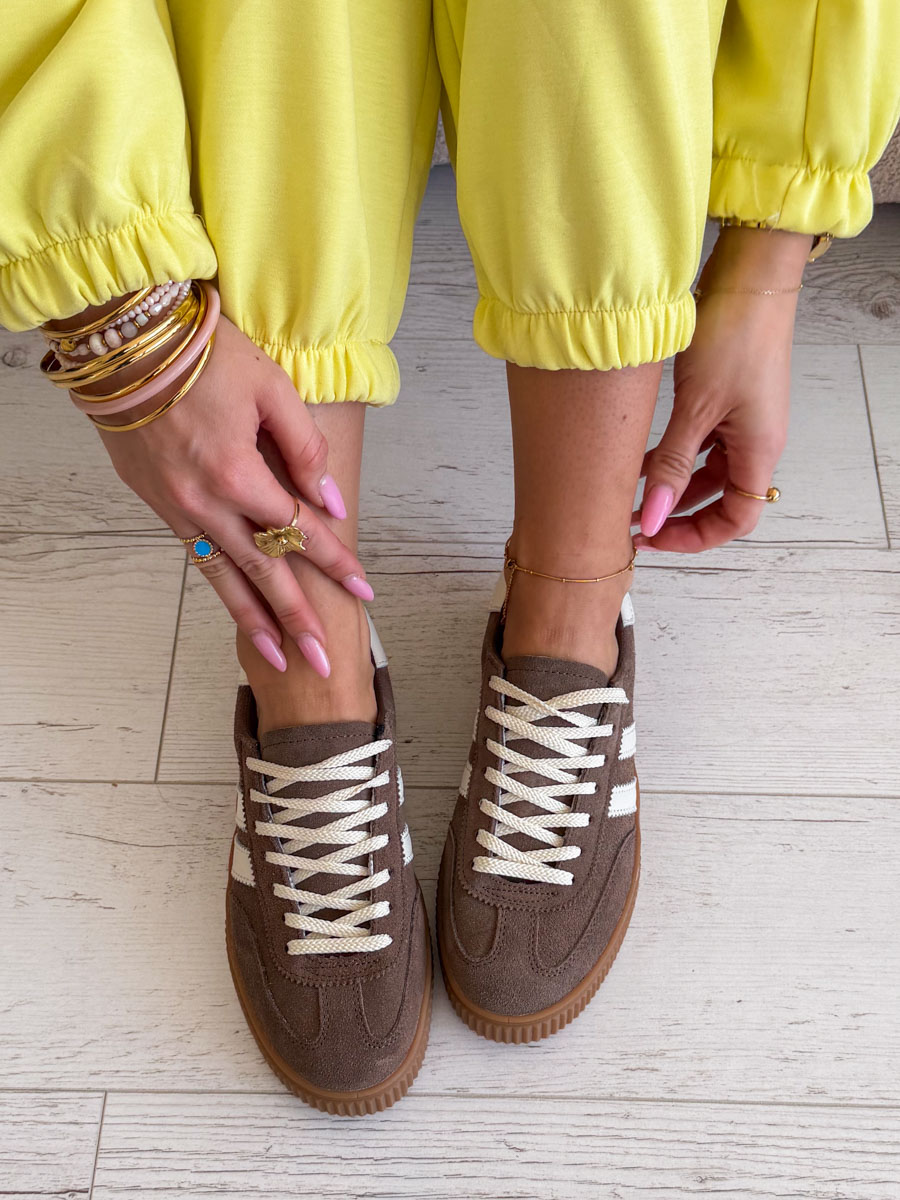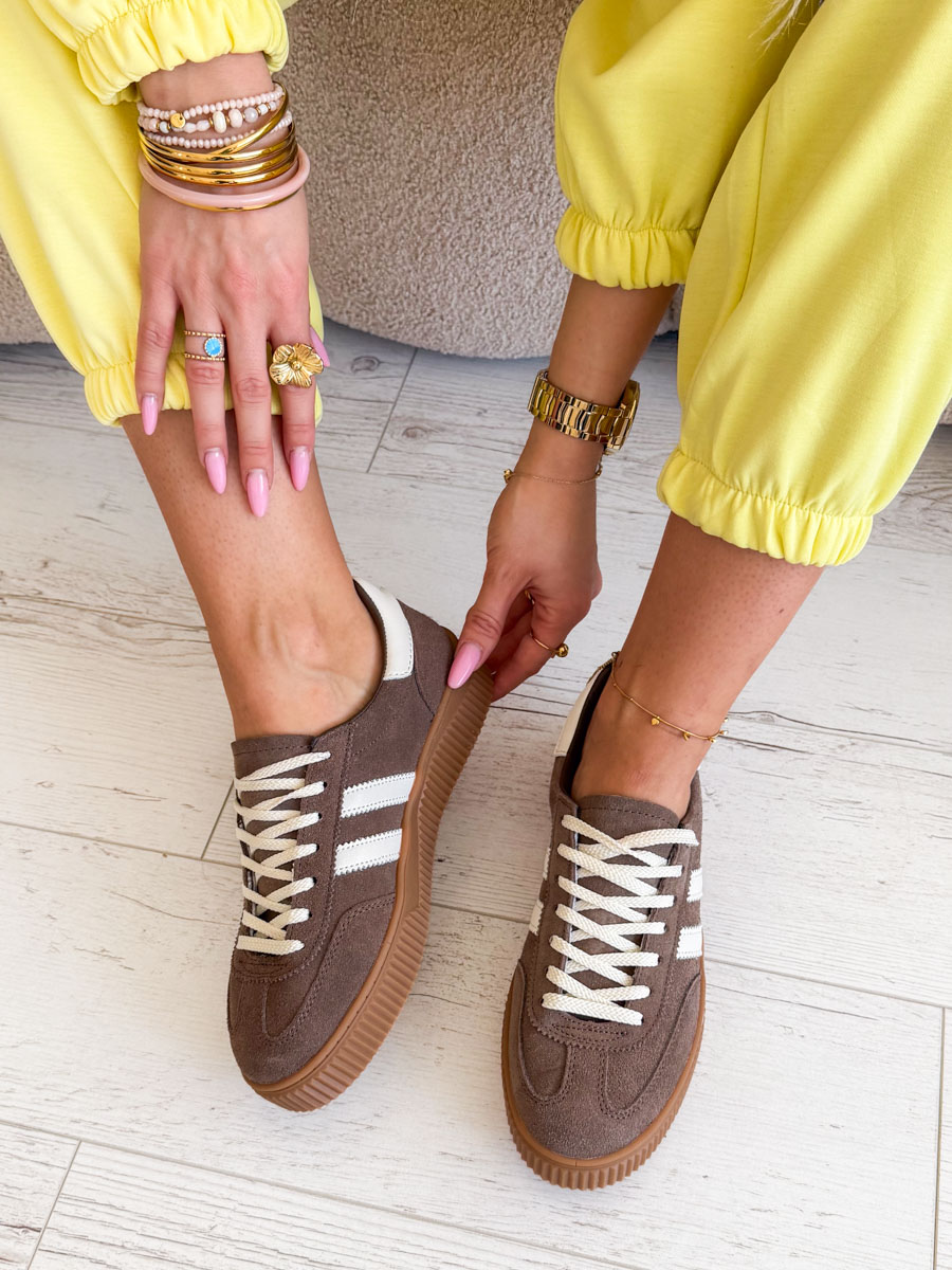 Skórzane sneakersy na platformieto połączenie sportowej wygody i modnego stylu. Wykonane z wysokiej jakości skóry, zapewniają komfort i trwałość podczas codziennego noszenia. Paski nadają im nowoczesnego charakteru, a platformowa podeszwa w karmelowym odcieniu delikatnie podnosi sylwetkę i zwiększa wygodę chodzenia. Idealne do codziennych stylizacji – świetnie pasują do jeansów, sukienek i sportowych zestawów.