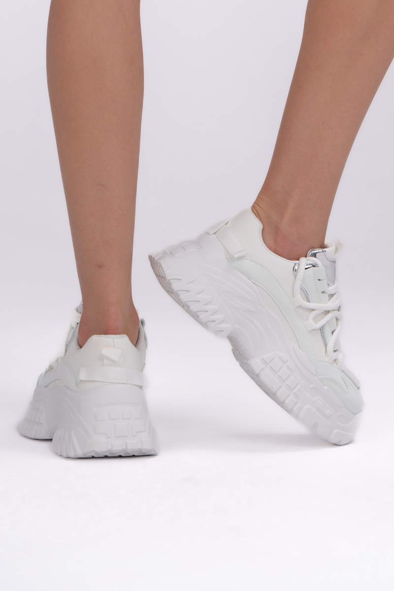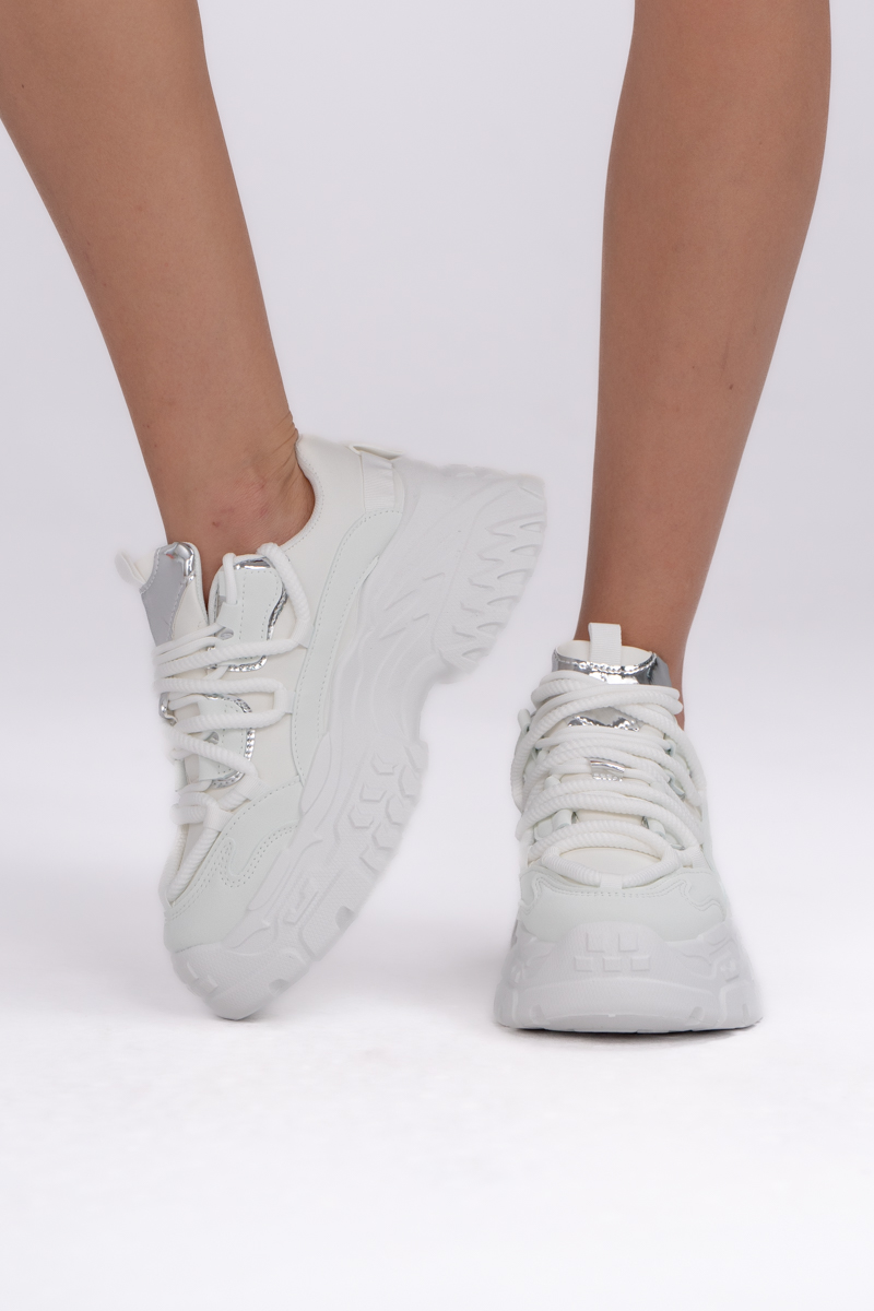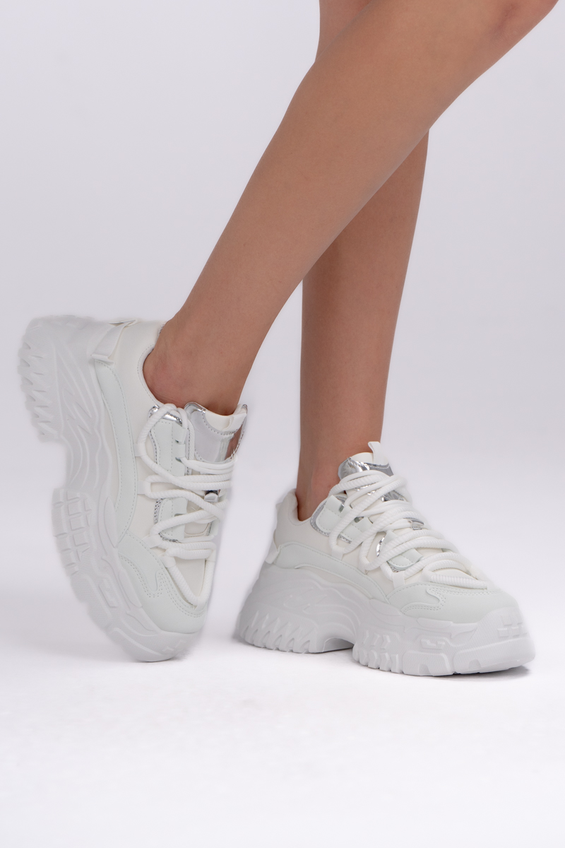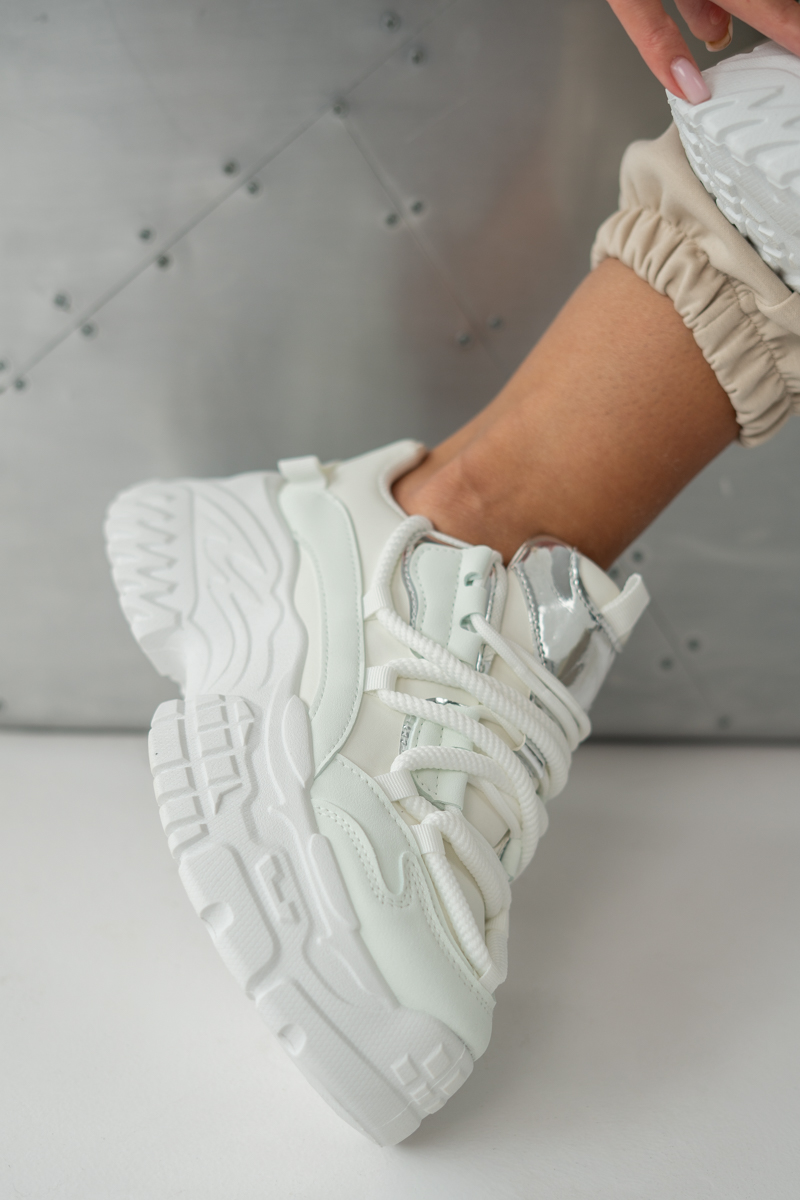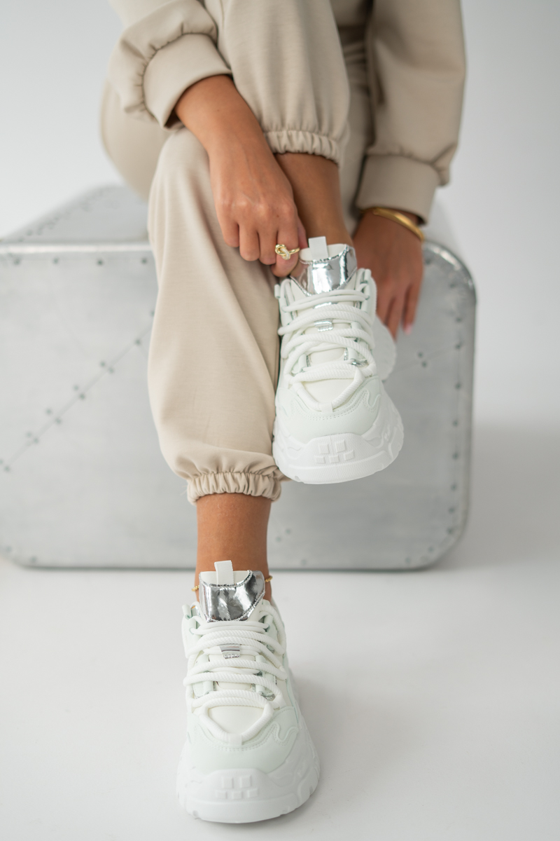 Sneakersy dad shoes Białe – Vivanea to modne obuwie w sportowym stylu, które wyróżnia się masywnym designem i nowoczesnym charakterem. Utrzymane w całości w bieli z subtelnymi, srebrnymi akcentami, prezentują się świeżo i stylowo, dzięki czemu łatwo dopasować je do wielu stylizacji. Gruba podeszwa typu dad shoes zapewnia komfort, stabilność oraz optyczne wysmuklenie sylwetki, a miękka cholewka i klasyczne sznurowanie gwarantują idealne dopasowanie do stopy. To idealny wybór dla kobiet, które cenią wygodę i chcą dodać swoim codziennym outfitom odważnego, streetwearowego charakteru.