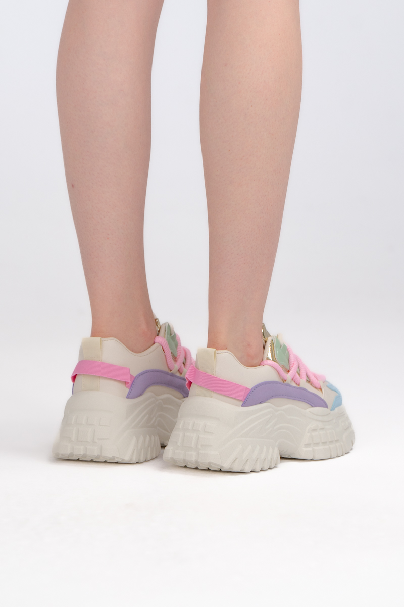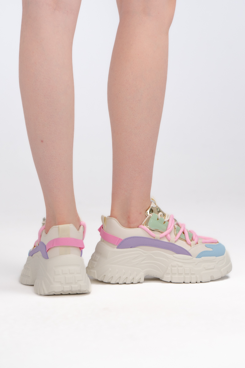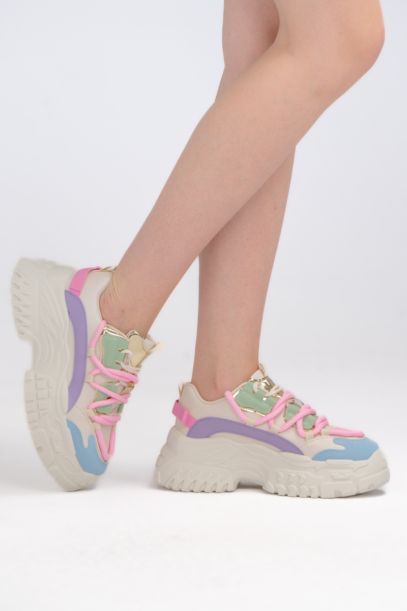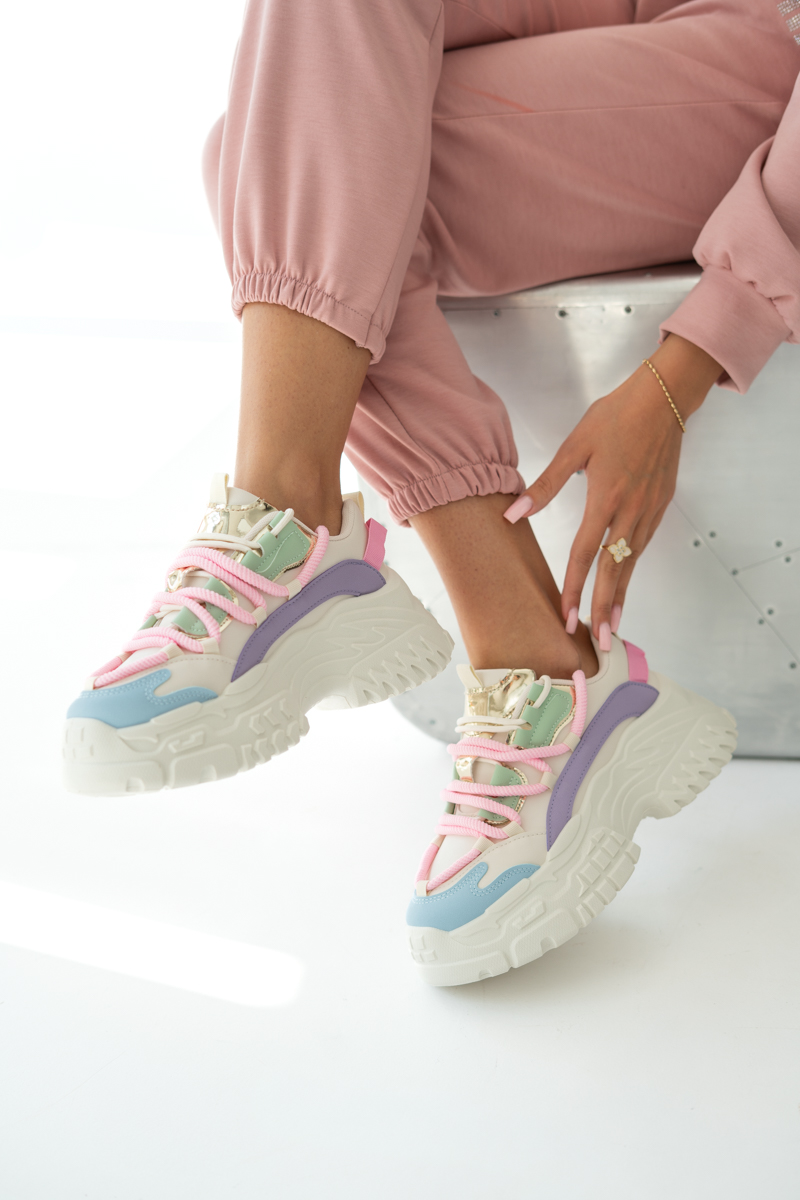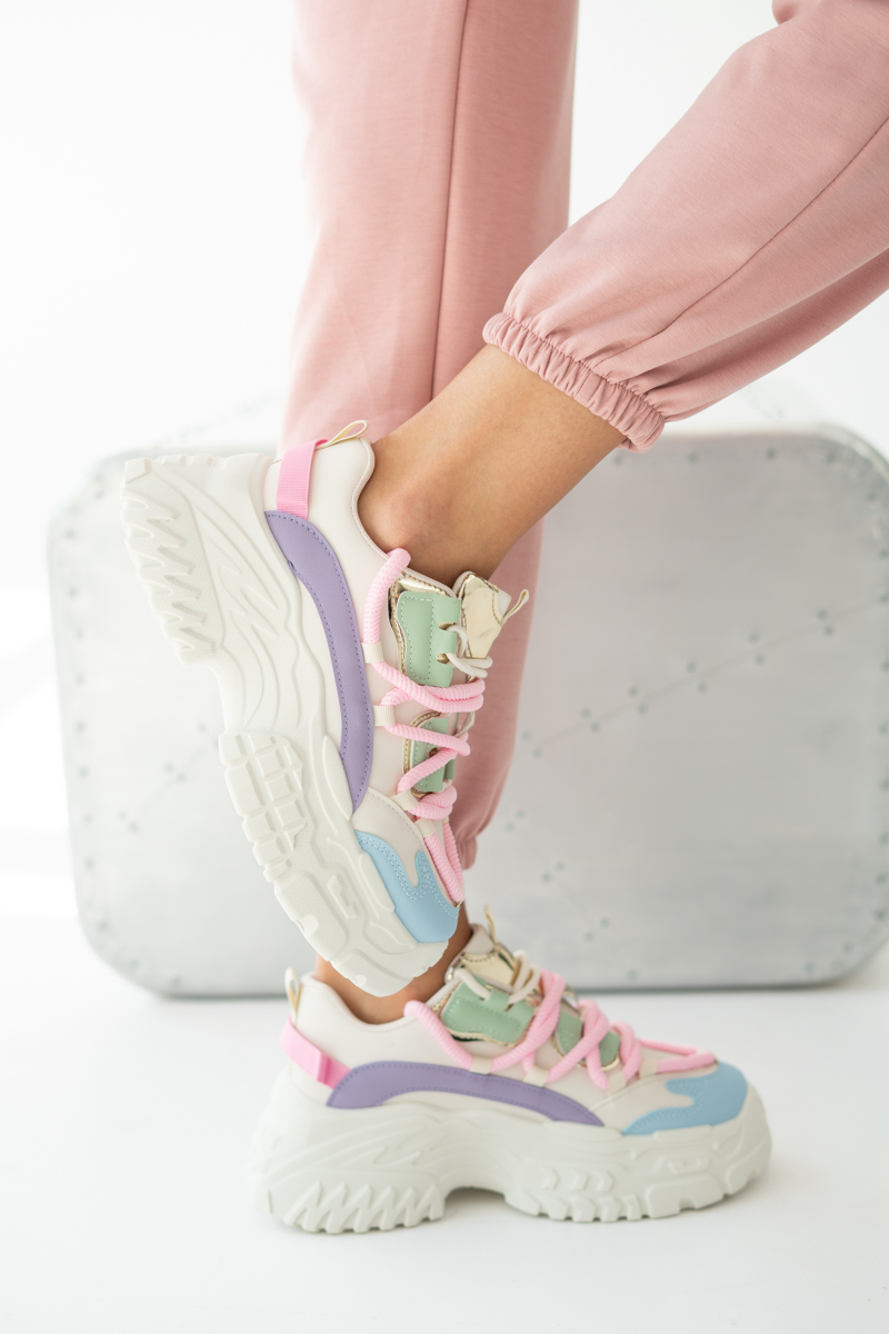Sneakersy dad shoes Wielokolorowe – Vivanea to odważna i stylowa propozycja dla kobiet, które lubią wyróżniać się swoim obuwiem. Wykonane w efektownym połączeniu pastelowych barw – błękitu, różu, fioletu i zieleni – przyciągają uwagę i nadają każdej stylizacji modnego charakteru. Masywna podeszwa typu dad shoes zapewnia wygodę, stabilność oraz optyczne wysmuklenie sylwetki. Miękka cholewka i sznurowanie umożliwiają idealne dopasowanie do stopy, gwarantując komfort przez cały dzień. To sneakersy stworzone z myślą o kobietach, które cenią wygodę, ale jednocześnie chcą wnieść do swojego looku nutę ekstrawagancji i energii.