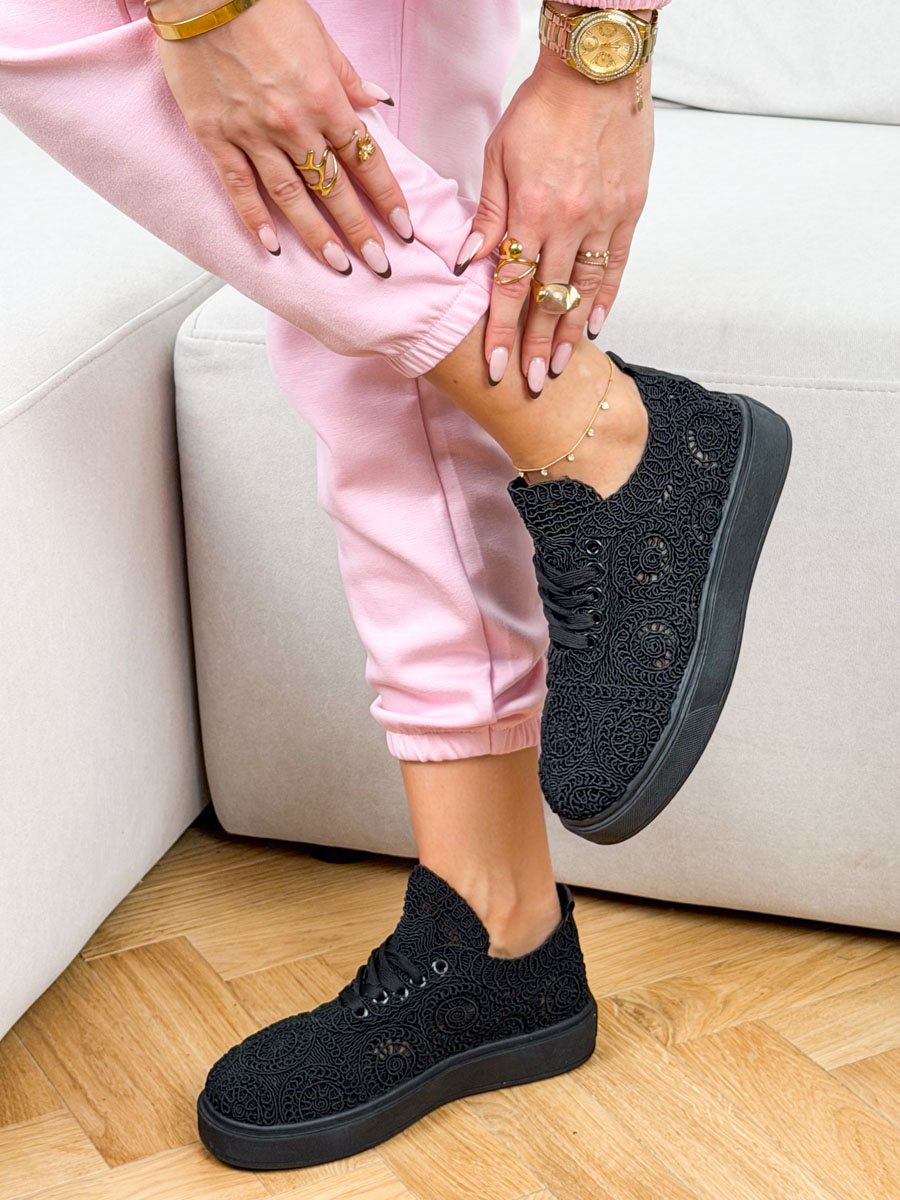 Sneakersy koronkowe w czarnym kolorze to idealne połączenie codziennej wygody z eleganckim, kobiecym akcentem. Wykonane ze skóry ekologicznej z dekoracyjnym, koronkowym wykończeniem, wyróżniają się oryginalnym wzorem, który nadaje im wyjątkowego charakteru. Klasyczna forma sneakersów zapewnia komfort noszenia przez cały dzień, a solidna podeszwa dobrze amortyzuje krok, co przekłada się na wygodę nawet przy intensywnym użytkowaniu. Czarny kolor dodaje uniwersalności i sprawia, że model łatwo dopasować zarówno do casualowych stylizacji, jak i bardziej eleganckich zestawów. To świetny wybór dla kobiet, które chcą czuć się swobodnie, a jednocześnie podkreślić swój styl modnym i niebanalnym detalem.