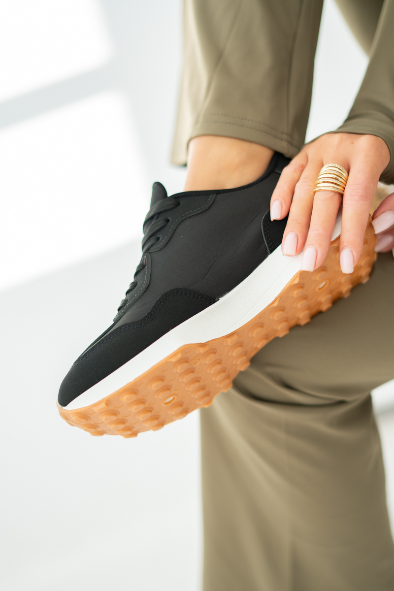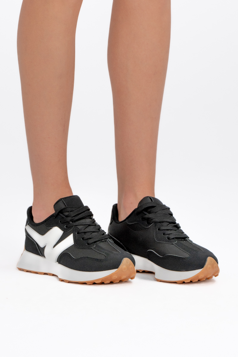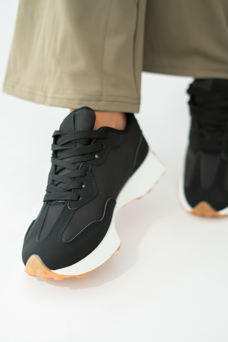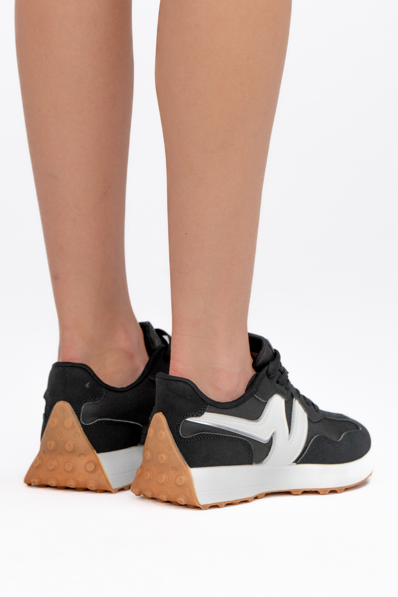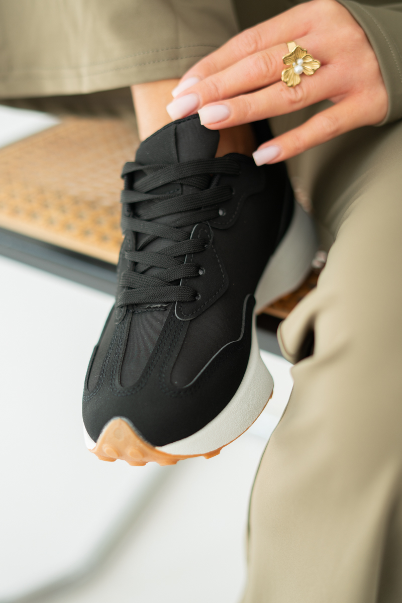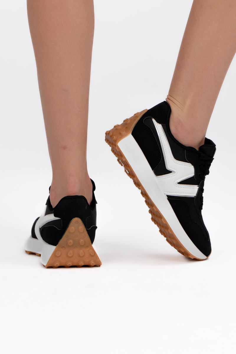 Sneakersy retro Czarne – Halivra to stylowe buty inspirowane klasyką sportowego obuwia, które doskonale sprawdzą się w codziennym użytkowaniu. Utrzymane w czarno-białej kolorystyce z kontrastową, karmelową podeszwą, prezentują się nowocześnie i uniwersalnie. Miękka cholewka i lekka konstrukcja zapewniają komfort noszenia, a solidna podeszwa gwarantuje stabilność i dobrą przyczepność. Klasyczne sznurowanie umożliwia idealne dopasowanie do stopy, a retro fason nadaje całości modnego, miejskiego charakteru. To idealne sneakersy dla kobiet, które cenią wygodę, funkcjonalność i ponadczasowy design.