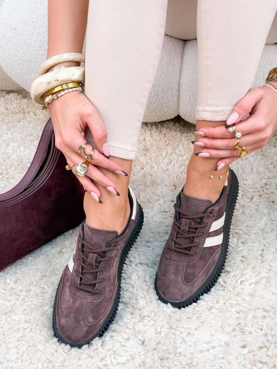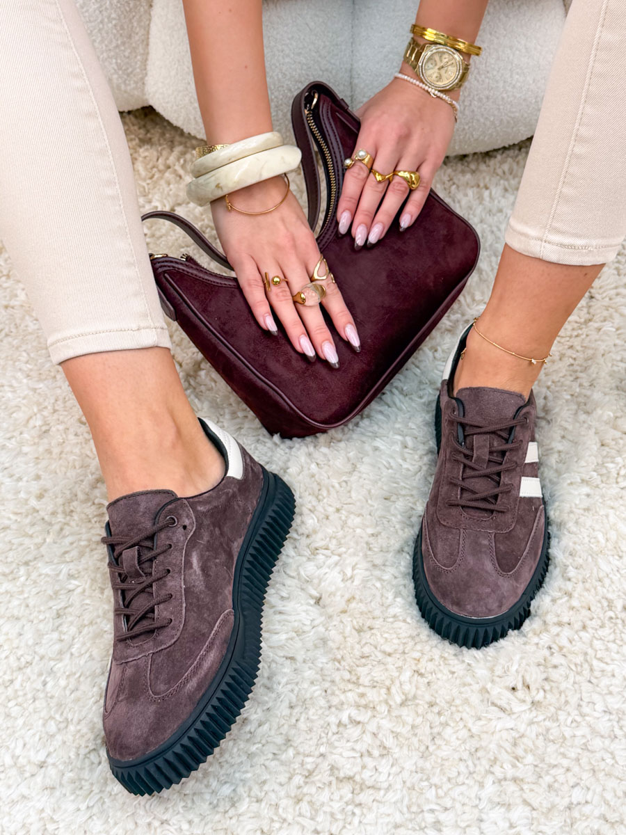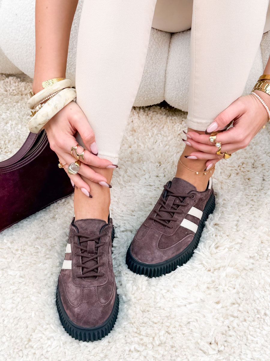 Sneakersy skórzane damskie Czekoladowy – Vellora to połączenie wygody, jakości i modnego, miejskiego stylu. Model wykonany został z wysokiej jakości skóry naturalnej w głębokim, czekoladowym odcieniu, który prezentuje się elegancko i stanowi ciekawą alternatywę dla klasycznych kolorów. Charakterystyczne boczne paski dodają sportowego akcentu i podkreślają nowoczesny design. Solidna, lekko masywna podeszwa zapewnia dobrą amortyzację oraz stabilność podczas chodzenia, sprawdzając się w codziennym użytkowaniu. Sznurowane zapięcie umożliwia idealne dopasowanie butów do stopy. Sneakersy doskonale komponują się zarówno z jeansami, jak i z bardziej kobiecymi stylizacjami, oferując komfort i styl na co dzień.