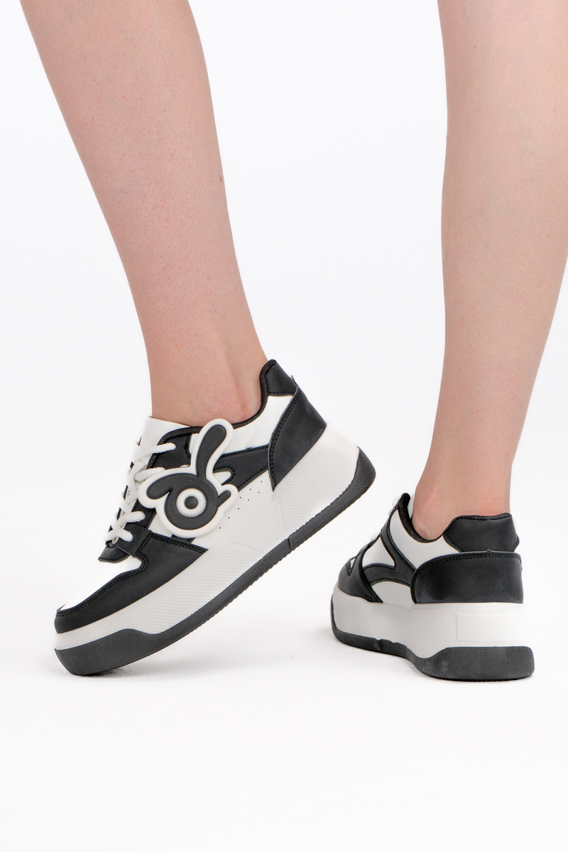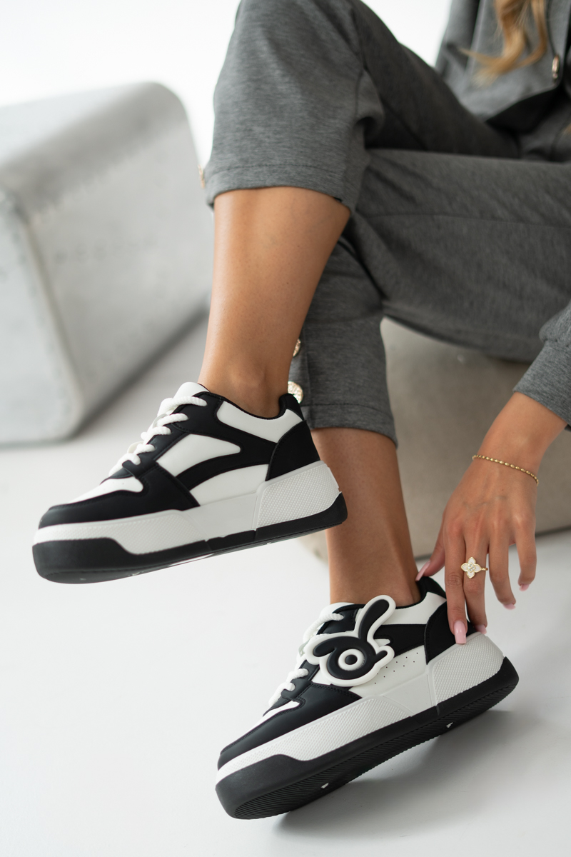 Sneakersy z ozdobną aplikacją na wysokiej platformie Czarne – Palirra to nowoczesne obuwie, które wyróżnia się wyrazistym designem i komfortem noszenia. Utrzymane w czarno-białej kolorystyce, prezentują się stylowo i uniwersalnie, pasując do wielu codziennych stylizacji. Charakterystycznym elementem jest ozdobna aplikacja po boku, która nadaje butom unikalnego charakteru. Wysoka podeszwa typu platforma zapewnia stabilność, wygodę oraz optyczne wydłużenie sylwetki. Miękka cholewka i klasyczne sznurowanie gwarantują dobre dopasowanie do stopy. To idealne sneakersy dla kobiet ceniących nowoczesny styl i oryginalne detale.