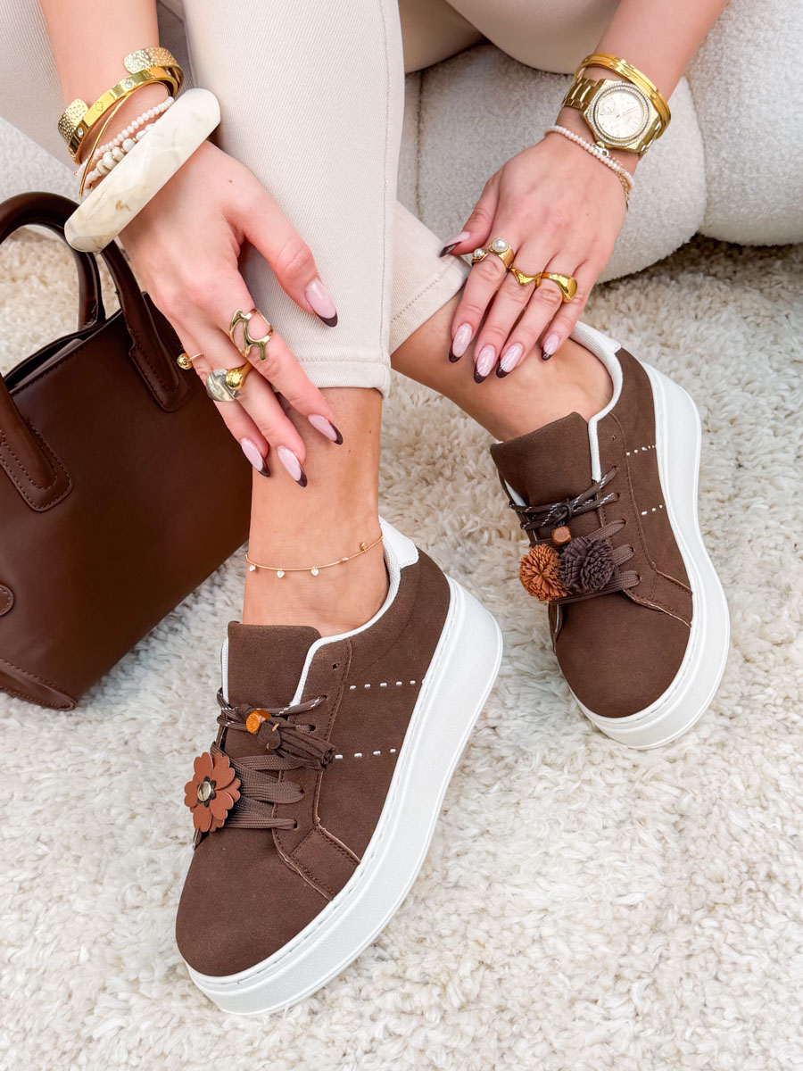 Ten model to idealna propozycja dla kobiet, które chcą połączyć wygodę z modnym, miejskim stylem. Sneakersy z podwójnymi sznurówkami Czekoladowe zostały wykonane z ekologicznej skóry zamszowej, dzięki czemu są miękkie, estetyczne i przyjemne w codziennym noszeniu. Platforma subtelnie podwyższa sylwetkę, jednocześnie zapewniając stabilność i komfort nawet podczas dłuższego użytkowania. Podwójne sznurówki pozwalają na lepsze dopasowanie butów do stopy oraz stanowią oryginalny akcent wizualny, który wyróżnia ten model na tle klasycznych sneakersów. Głęboki czekoladowy kolor dodaje elegancji i świetnie komponuje się zarówno z jasnymi, jak i ciemniejszymi stylizacjami. To doskonały wybór na co dzień – do jeansów, sukienek i nowoczesnych, casualowych zestawów.