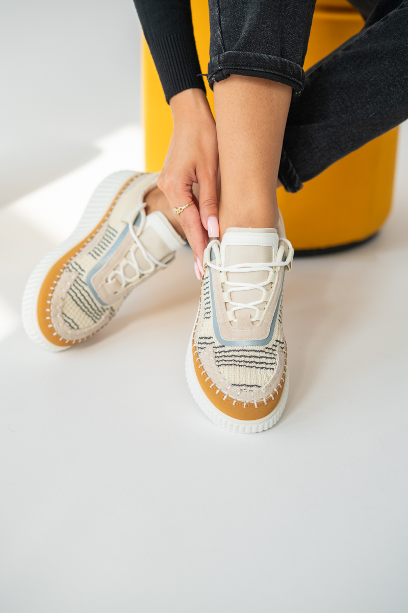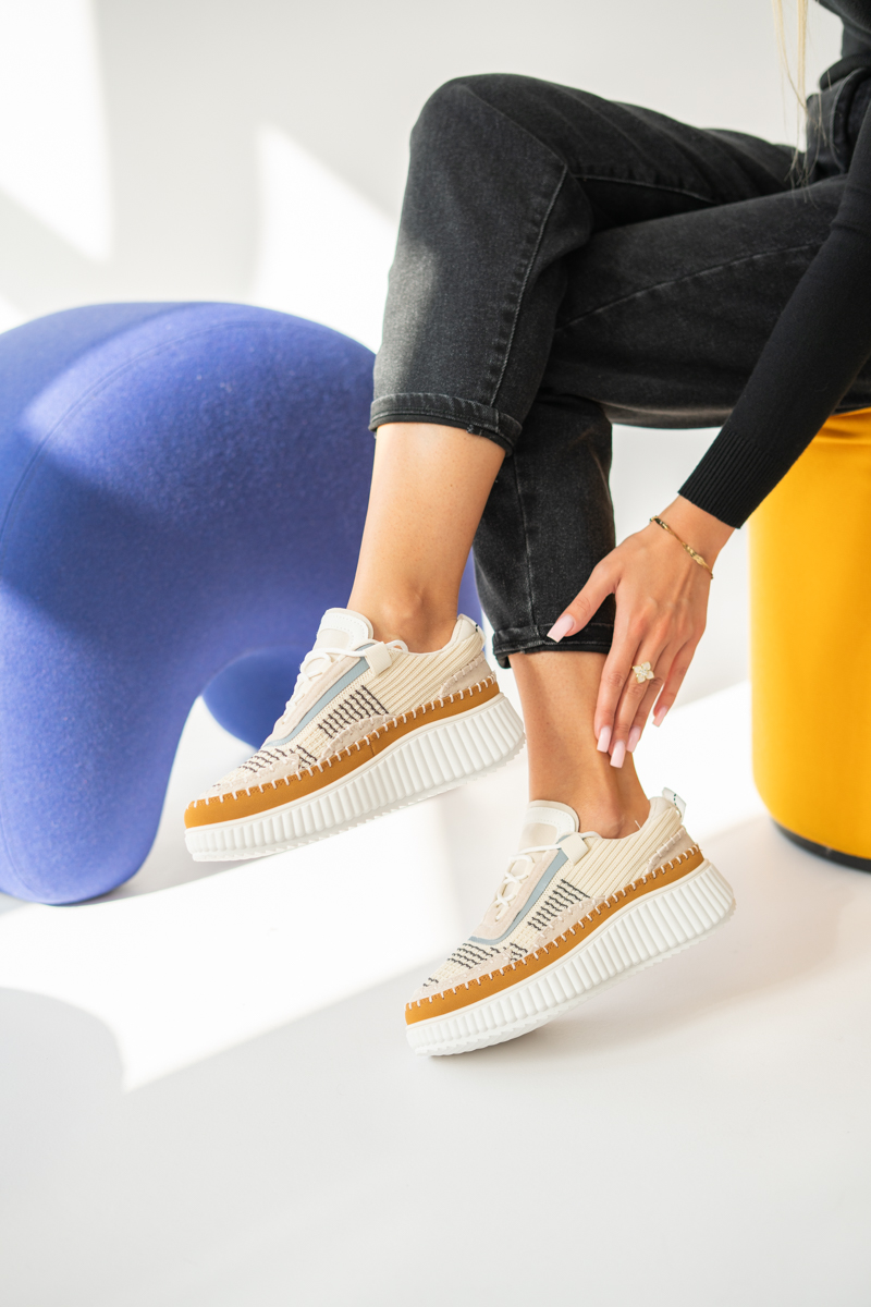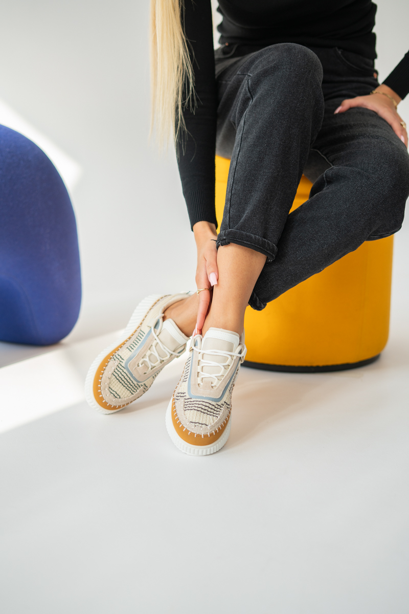 Beżowe sneakersy damskie Riseora na platformie to idealne połączenie sportowego luzu i kobiecej elegancji. Wykonane z miękkiego zamszu i tkaniny o ciekawym wzorze, prezentują się niezwykle stylowo. Wysoka, kontrastowa podeszwa dodaje kilku centymetrów wzrostu, a przy tym zapewnia wygodę i stabilność podczas noszenia. Beżowa kolorystyka z subtelnymi detalami w odcieniach karmelu i szarości sprawia, że buty świetnie komponują się zarówno z jeansami, jak i bardziej casualowymi sukienkami. To model, który podkreśli Twój nowoczesny, miejski styl i doda charakteru każdej stylizacji.