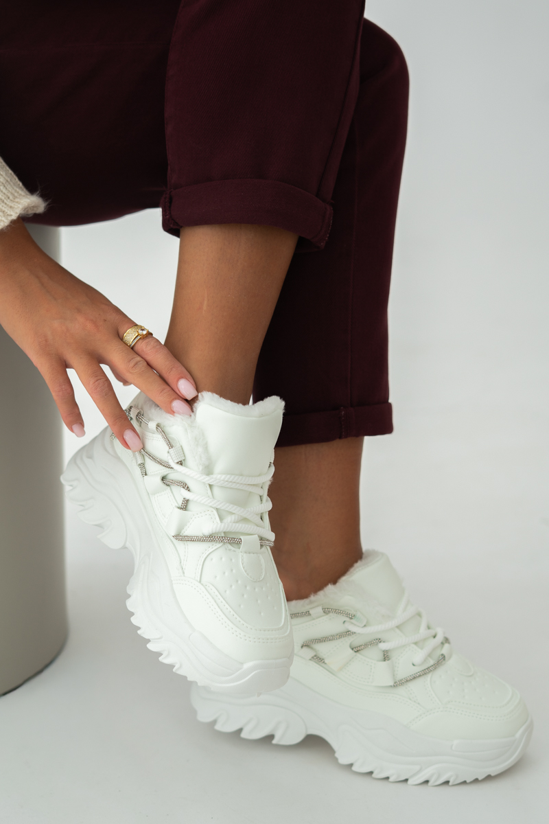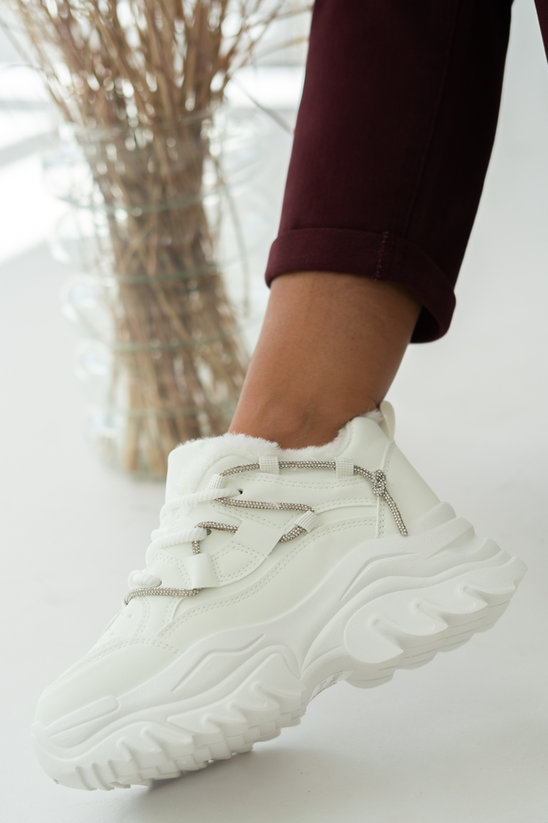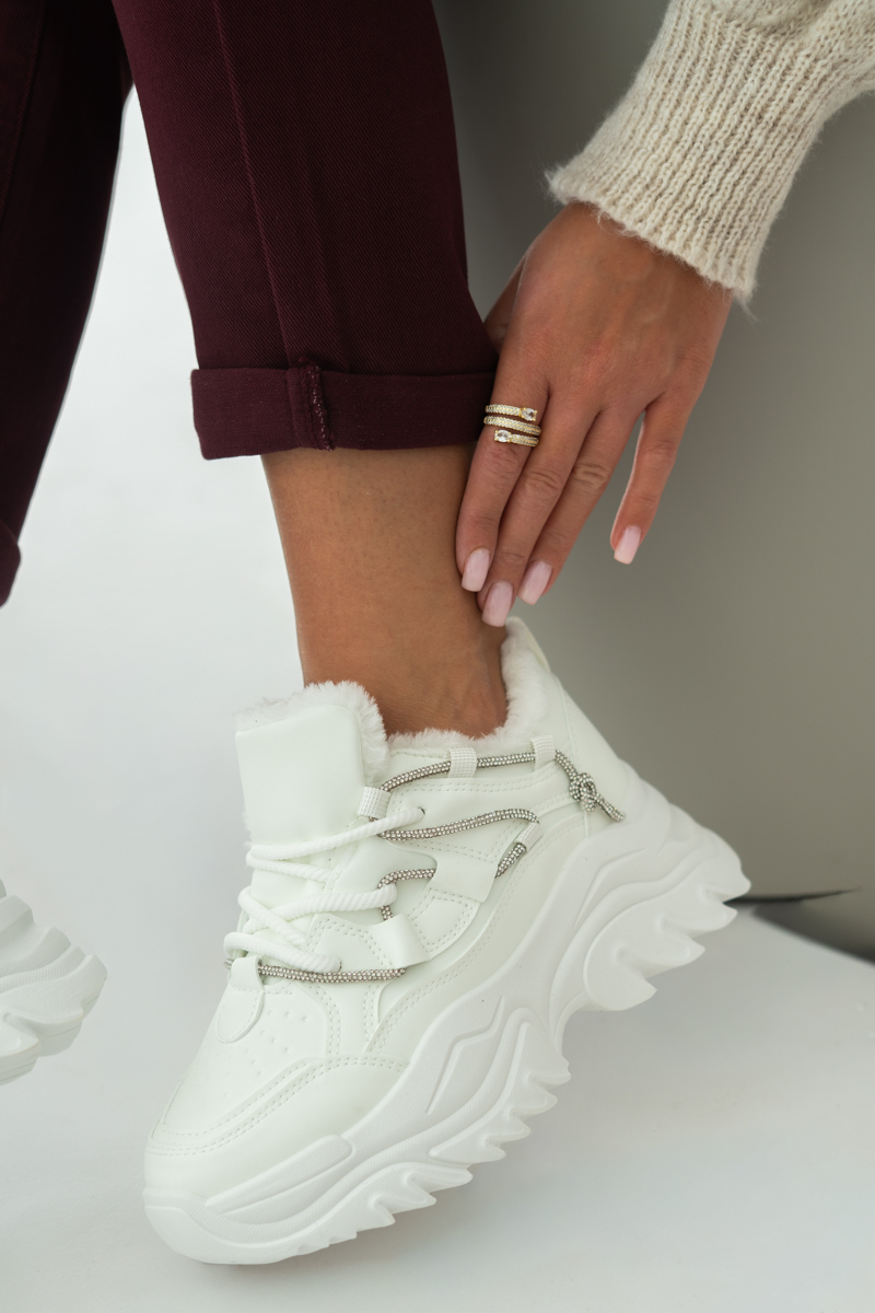 Sneakersy zimowe chunky w kolorze białym to stylowe i praktyczne obuwie, które świetnie sprawdzi się w chłodniejsze dni. Wykonane z trwałych materiałów, zapewniają komfort i odporność na codzienne użytkowanie. Wnętrze ocieplone miękkim futerkiem gwarantuje ciepło, a sznurowanie umożliwia idealne dopasowanie do stopy. Charakterystyczna, masywna podeszwa w stylu chunky dodaje nowoczesnego wyglądu, a jednocześnie zapewnia stabilność i dobrą przyczepność. Klasyczna biel sprawia, że sneakersy są uniwersalne i łatwo dopasowują się do wielu zimowych stylizacji, nadając im świeżości i sportowego charakteru.