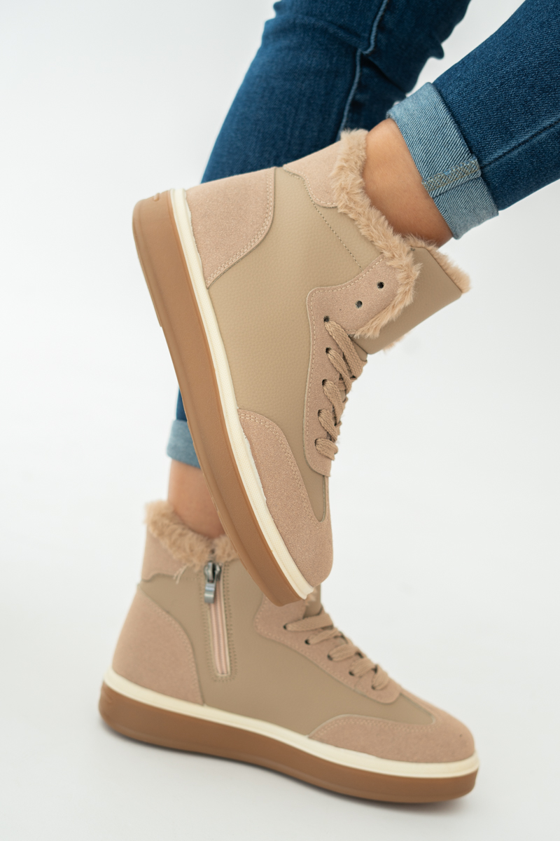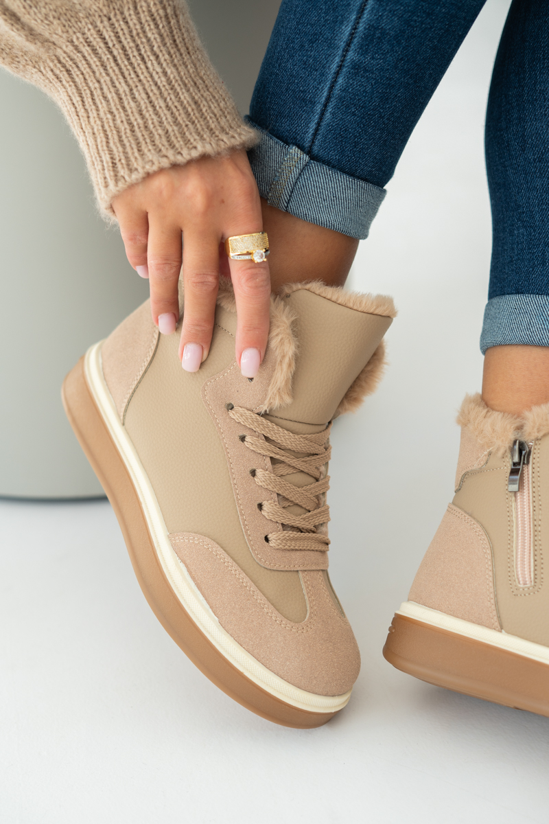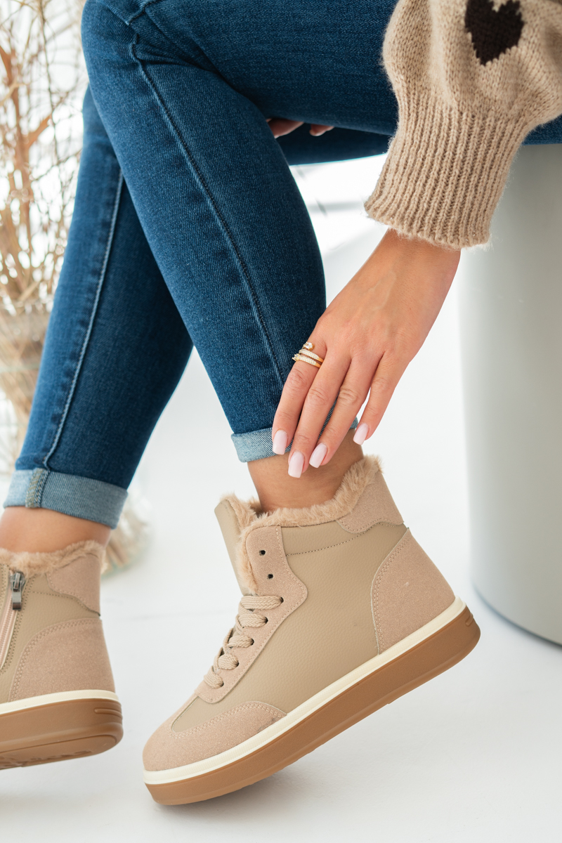 Damskie buty zimowe z futerkiem w kolorze fango to praktyczny i modny wybór na chłodniejsze dni. Wykonane z trwałego materiału, gwarantują wygodę i ochronę przed zimnem, a miękkie ocieplenie wewnątrz zapewnia przyjemne ciepło nawet w mroźne poranki. Model wyposażony jest w sznurowanie, które pozwala na idealne dopasowanie do stopy, oraz boczny zamek ułatwiający szybkie zakładanie. Solidna podeszwa z delikatnym bieżnikiem dba o stabilność i komfort chodzenia. Neutralny, beżowo–piaskowy odcień sprawia, że buty świetnie komponują się z codziennymi stylizacjami, dodając im lekkości i nowoczesnego charakteru.