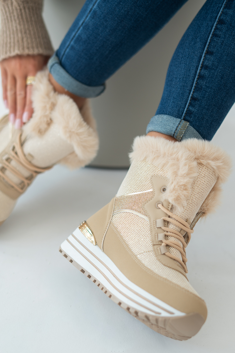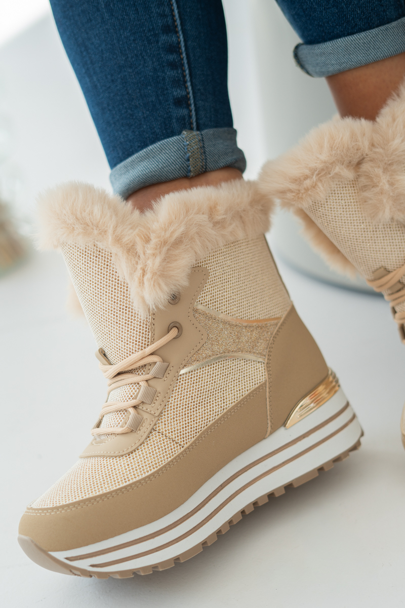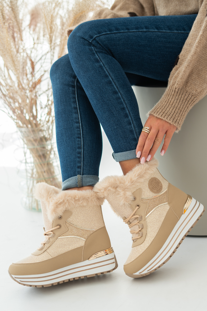 Sneakersy zimowe damskie na koturnie w kolorze fango to połączenie sportowego stylu i praktycznego komfortu na zimę. Wykonane z wysokiej jakości materiałów, gwarantują trwałość i wygodę noszenia. Miękkie, futrzane ocieplenie wewnątrz zapewnia ciepło nawet w chłodne dni, a ukryty koturn delikatnie podnosi sylwetkę, dodając kobiecego charakteru bez rezygnacji z komfortu. Gruba podeszwa z kontrastowymi detalami nadaje im nowoczesny wygląd i zapewnia stabilność podczas chodzenia. Stonowany beżowo–piaskowy odcień fango świetnie komponuje się z zimowymi stylizacjami, sprawiając, że sneakersy są zarówno modne, jak i praktyczne.