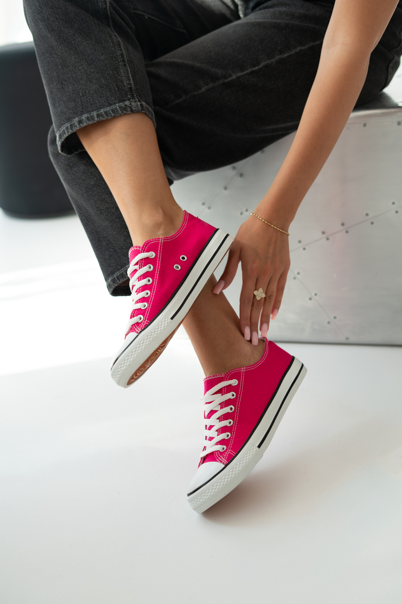 Trampki casualowe damskie w intensywnym kolorze fuksji to propozycja, która doda energii każdej stylizacji. Wykonane z lekkiej i przewiewnej tkaniny gwarantują komfort noszenia przez cały dzień, a klasyczny sznurowany fason zapewnia dobre dopasowanie do stopy. Model został osadzony na solidnej platformie, która nie tylko dodaje kilku centymetrów wzrostu, ale również podkreśla modny, streetwearowy charakter obuwia. Białe detale i gumowa podeszwa z kontrastowym paskiem nadają całości świeżego, sportowego stylu. Idealne do jeansów, szortów czy letnich sukienek – niezawodny wybór na co dzień.
